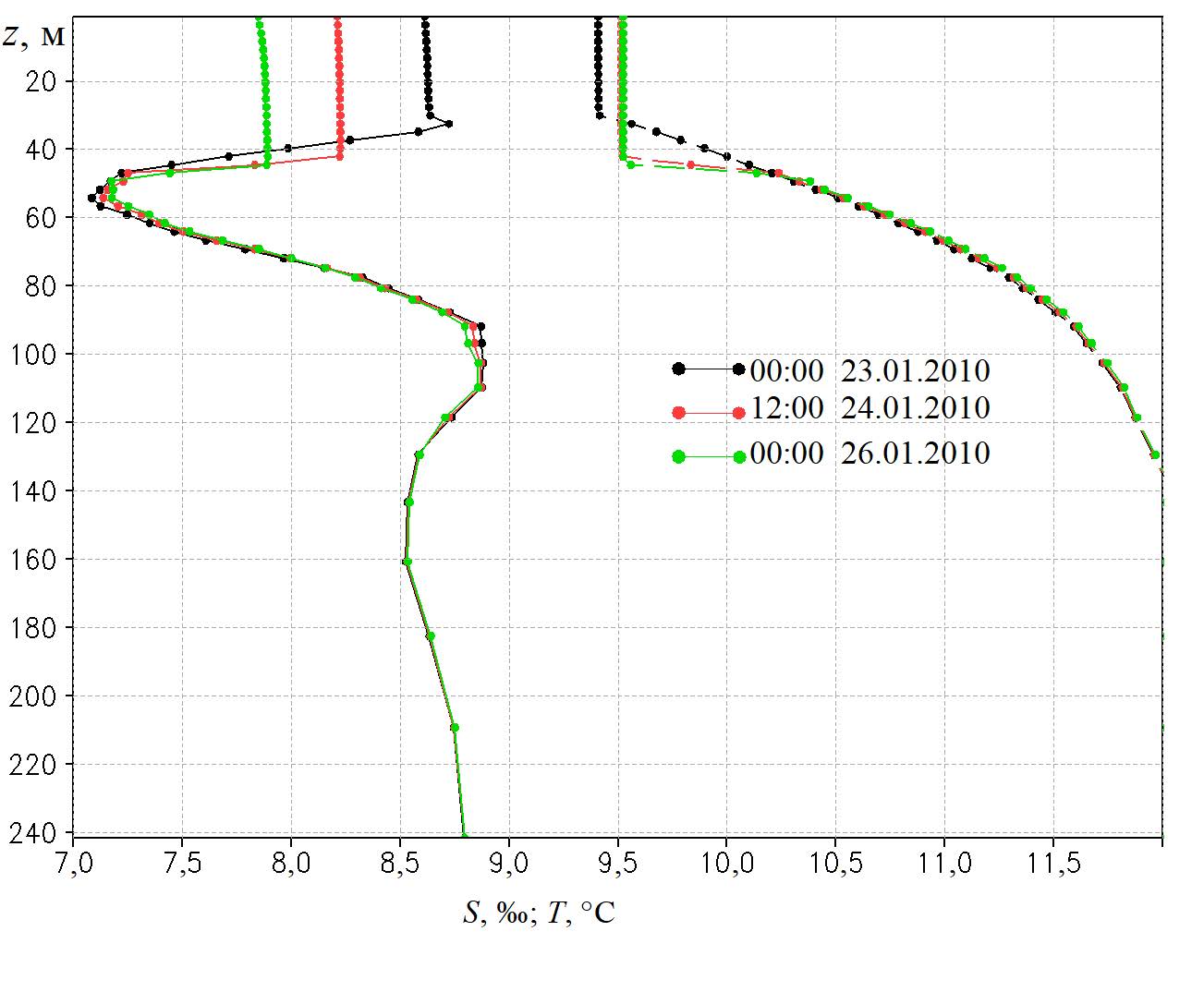 Рис.6. Вертикальные профили температуры T, ℃ (сплошная линия), и солености S, ‰ (штриховая линия), в точке с координатами 32 в. д., 44 с. ш. в 00:00 23 января, 12:00 24 января и 00:00 26 января 2010 г. Для наглядности показана не сама величина S, а разность (S – 8), ‰