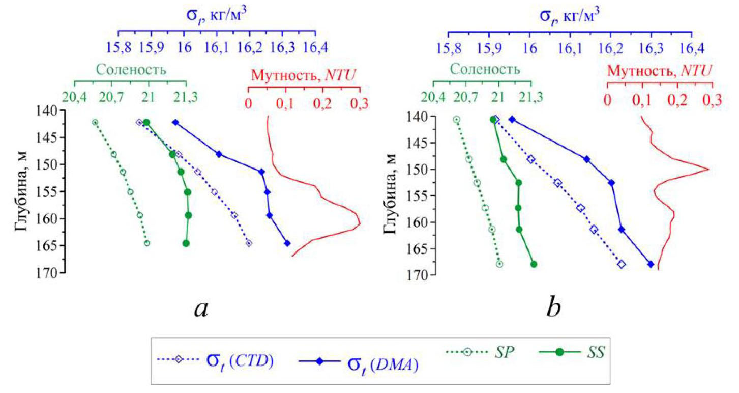 При сопоставлении полученных двумя способами результатов определения значений плотности исследуемых образцов с профилем мутности было обнаружено, что слой повышенной концентрации взвеси (пик мутности) находился в диапазоне максимальных значений Δσt (в слое ~ 160 м при σt, равной 16,04˗16,05 кг/м3). Из этого следует, что повышенная концентрация взвеси занижает значения электропроводности, а следовательно, и значений солености и плотности, вычисленных при расчетах с ее использованием, и является третьей причиной ошибок при определении плотности и солености по данным CTD-зонда.