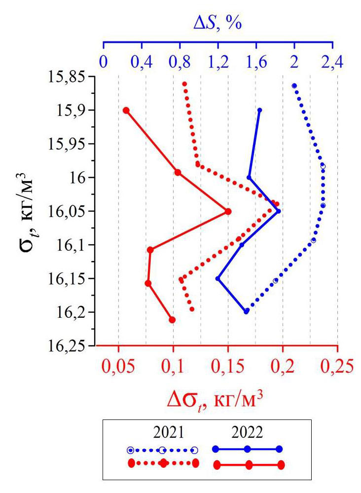 На рис. 2 особенно выделяется слой с максимальными отклонениями Δσt и ΔS в 2021 г. при σt = 16,04 кг/м3 (на глубине 151,3 м) и в 2022 г. при σt = 16,05 кг/м3 (на глубине 152,6 м), то есть при почти одинаковых условиях. Этому слою соответствует пик мутности, который представлен на рис. 1. Этот слой в Черном море представляет собой верхнюю границу сероводородной зоны и нижнюю – субкислородной [12, 14]. Рисунок 2 является подробной версией рис. 1 и позволяет увидеть, что пикноклин имеет ярко выраженные градиенты плотности и солености, а его ядро располагается при σt ~ 16,05 кг/м3, но при этом его глубина может варьироваться, так как основному черноморскому пикноклину свойственны короткопериодные колебания [9].