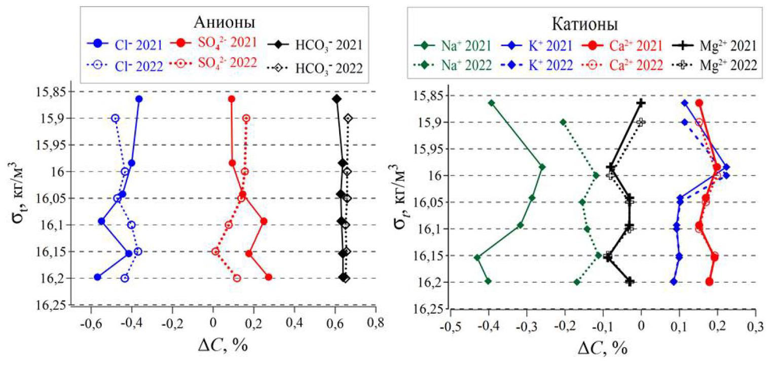 Относительное содержание ионов Mg²⁺ в воде Черного моря было очень близко их содержанию в СМВ, а K⁺ и Ca²⁺ было больше на ~ 0,2 %, чем в СМВ. На профилях относительного содержания ионов, а особенно катионов, наблюдается хорошая корреляция между 2021 и 2022 гг.