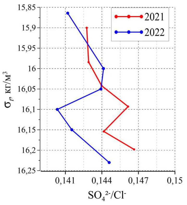 На рис. 4 видно, что распределение не однородно в исследуемом диапазоне σt. Сульфат-хлорное соотношение, монотонно убывающее до глубины 1200 м [15], в субкислородном слое скачкообразно меняет значения на 1−2 %. Корреляция этих изменений как в 2021 г., так и в 2022 г. свидетельствует о закономерности этого явления. В работе [15] также отмечается нарушение линейности распределения концентрации по отношению к хлорности в верхней части анаэробной зоны – в области появления сероводорода и до глубины – ~ 200 м. Область дефицита сульфатов относительно хлорности совпадает со слоем увеличения массы бактериопланктона, в котором ускоряются процессы фиксации CO2 и сульфатредукции. Убыль сульфатов в данном слое, где часто присутствует локальный максимум взвешенного органического вещества, является следствием их восстановления в процессе сульфатредукции.