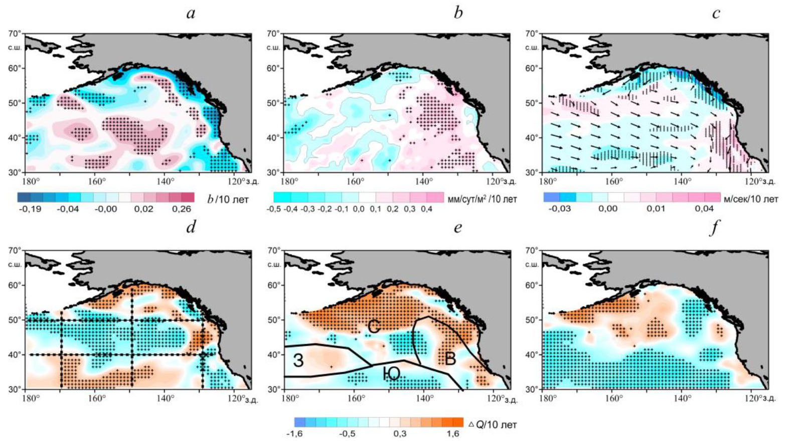 В исследуемой акватории выделяются северный (С) и восточный (В) районы с характерными чертами, присущими субарктической структуре вод, а также западный (З) и южный (Ю) районы с чертами, характерными для области смешения вод субарктической и субтропической структур (рис. 1, e) 1 [22]. В пределах всей акватории прослеживаются составляющие потоков Субарктического и Северо-Тихоокеанского течений, Калифорнийской и Аляскинской систем течений [22, 23], в межгодовых изменениях которых присутствуют статистически значимые тренды модуля скорости течений различного знака (рис. 1, c).