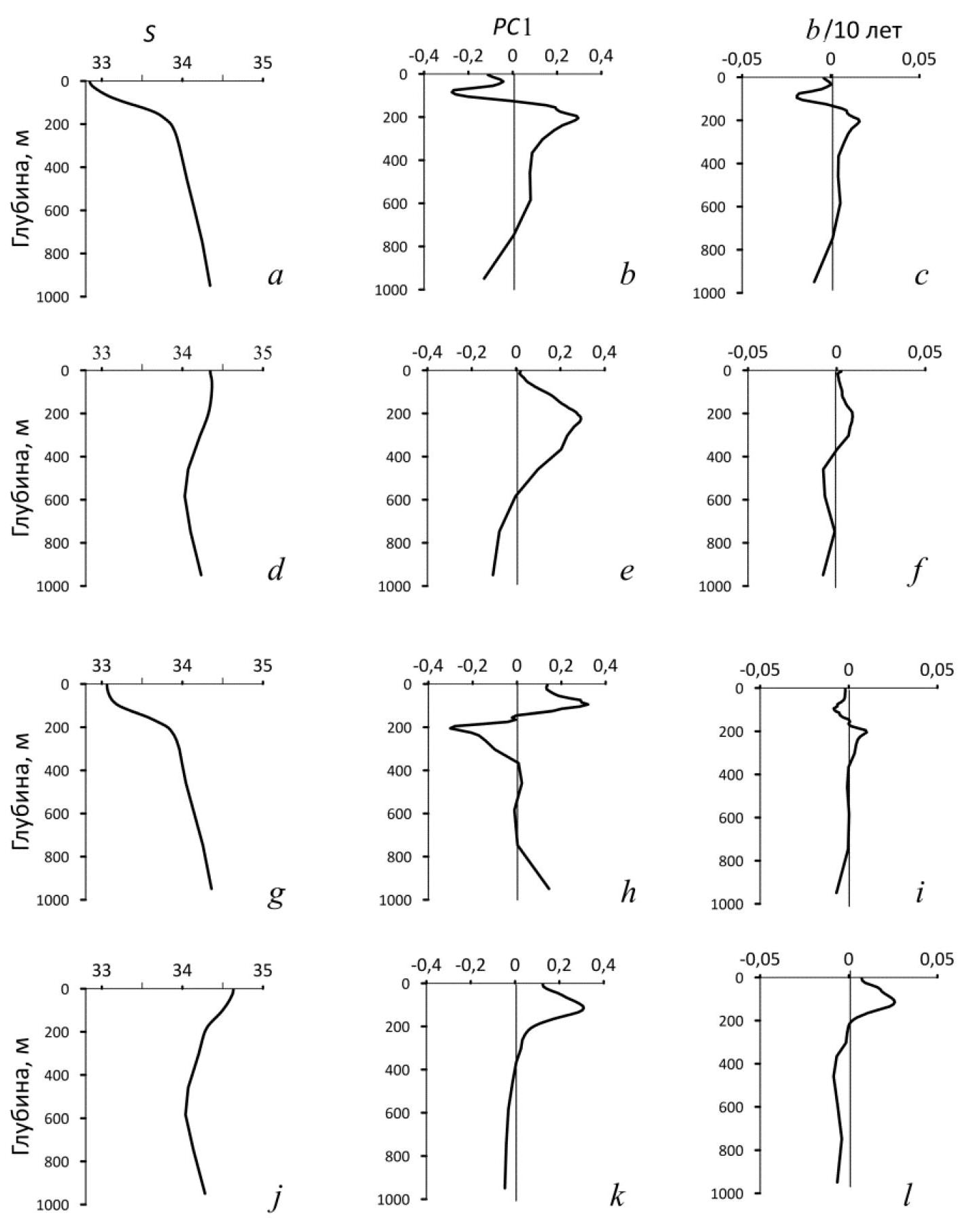 Рис. 2. Обобщенные кривые вертикального распределения солености (a, d, g, j), главного компонента PC1 ЭОФ аномалий солености (b, e, h, k) и тренда b солености на различных горизонтах (c, f, i, l) за 2000–2022 гг. Сверху вниз: районы С, З, В, Ю согласно рис. 1, e