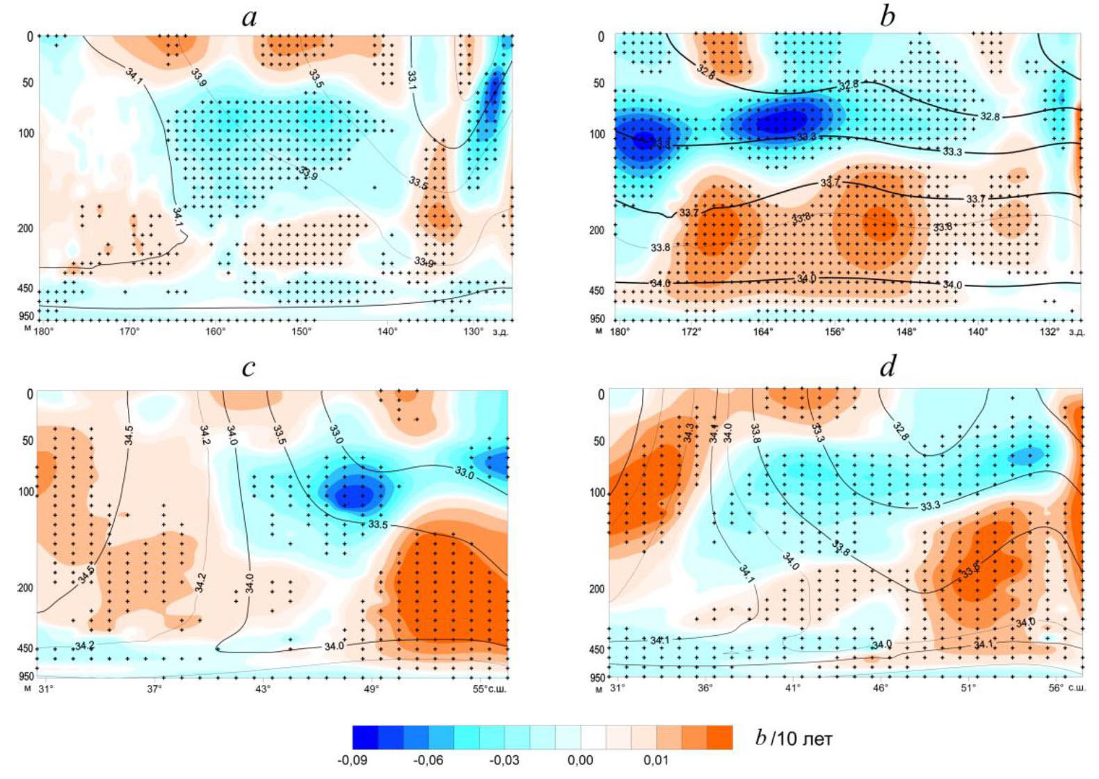 Формирование трендов межгодовых изменений солености на меридиональных разрезах по 170°, 150° и 130° з. д. (рисунок не приводится) происходит в условиях значительных пространственных градиентов поля солености (рис. 3, c, d; 1, d). Отметим, что максимальные отрицательные тренды солености со значением до –0,07/10 лет были локализованы на горизонтах 70 и 120 м в северной части западного разреза (170° з. д.) вблизи Алеутской островной гряды. Области с максимальными значениями положительных трендов S (0,06/10 лет) прослеживаются в различных участках верхнего и промежуточного слоев на всех рассматриваемых разрезах, где они вытянуты в широтном направлении.