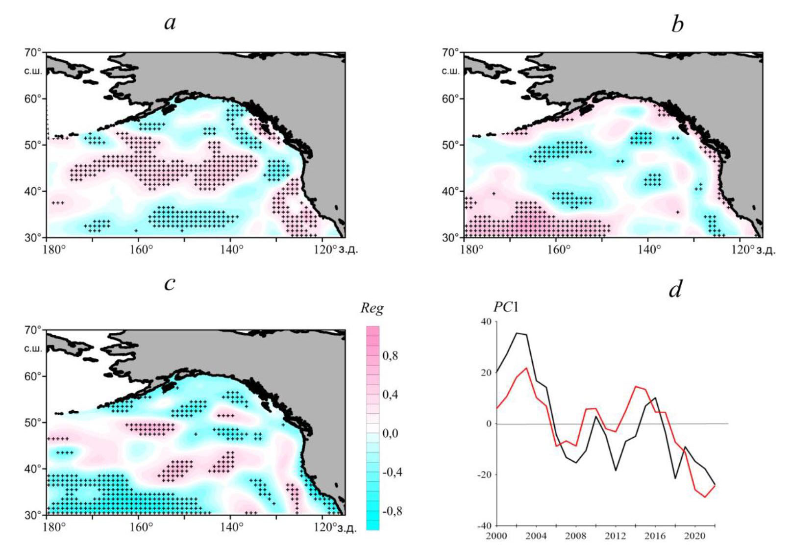 Объясненная дисперсия (R2) множественной регрессии изменчивости PC1(Qs) верхнего слоя 5–200 м и климатических переменных NPGO, PC1(E-P), PC2(∆H500) и PDO в период 2000–2022 гг. составила 60%, т. е. совокупность этих переменных удовлетворительно описывает наблюдаемые изменения главного компонента солесодержания (рис. 4, d).