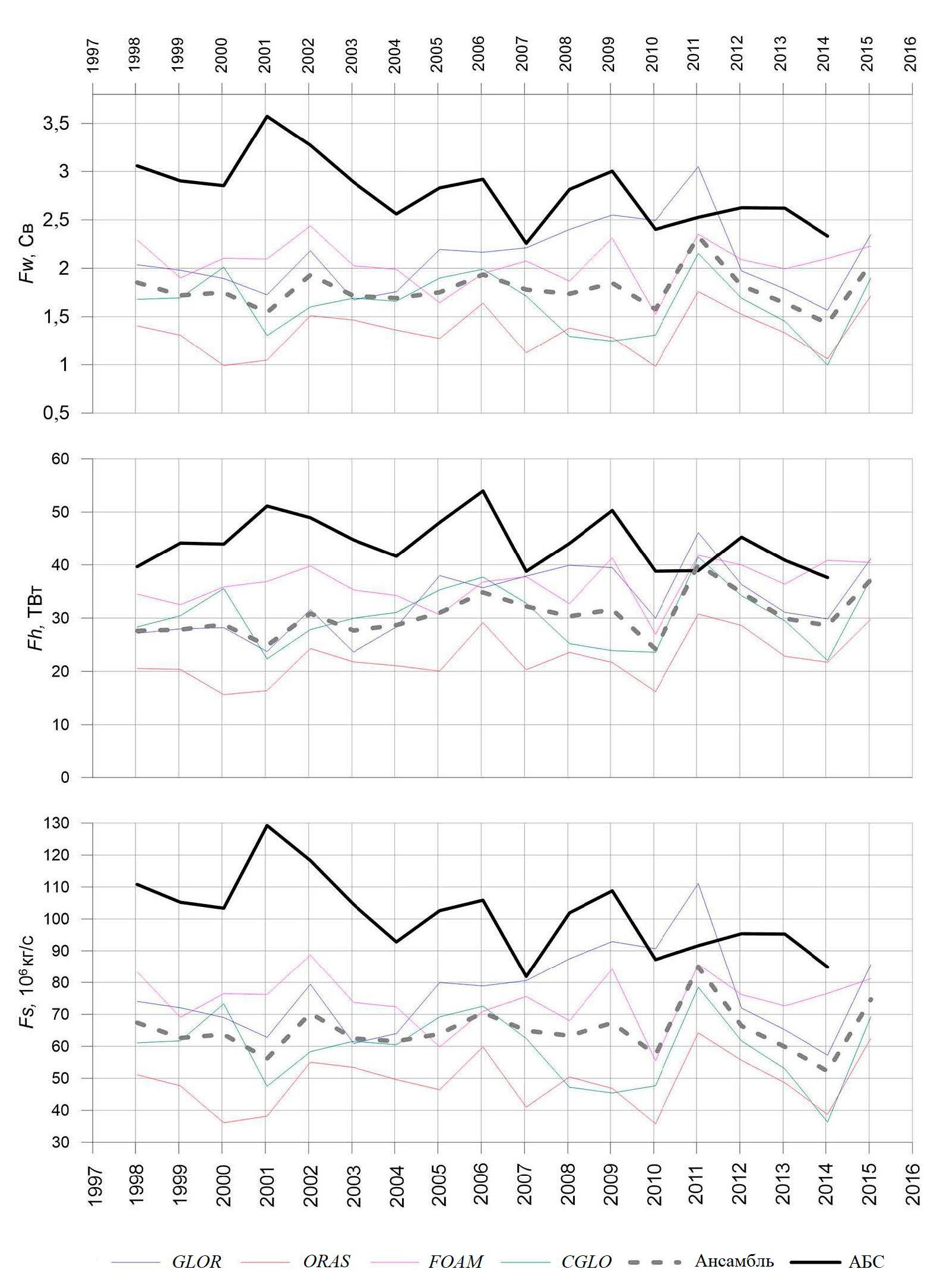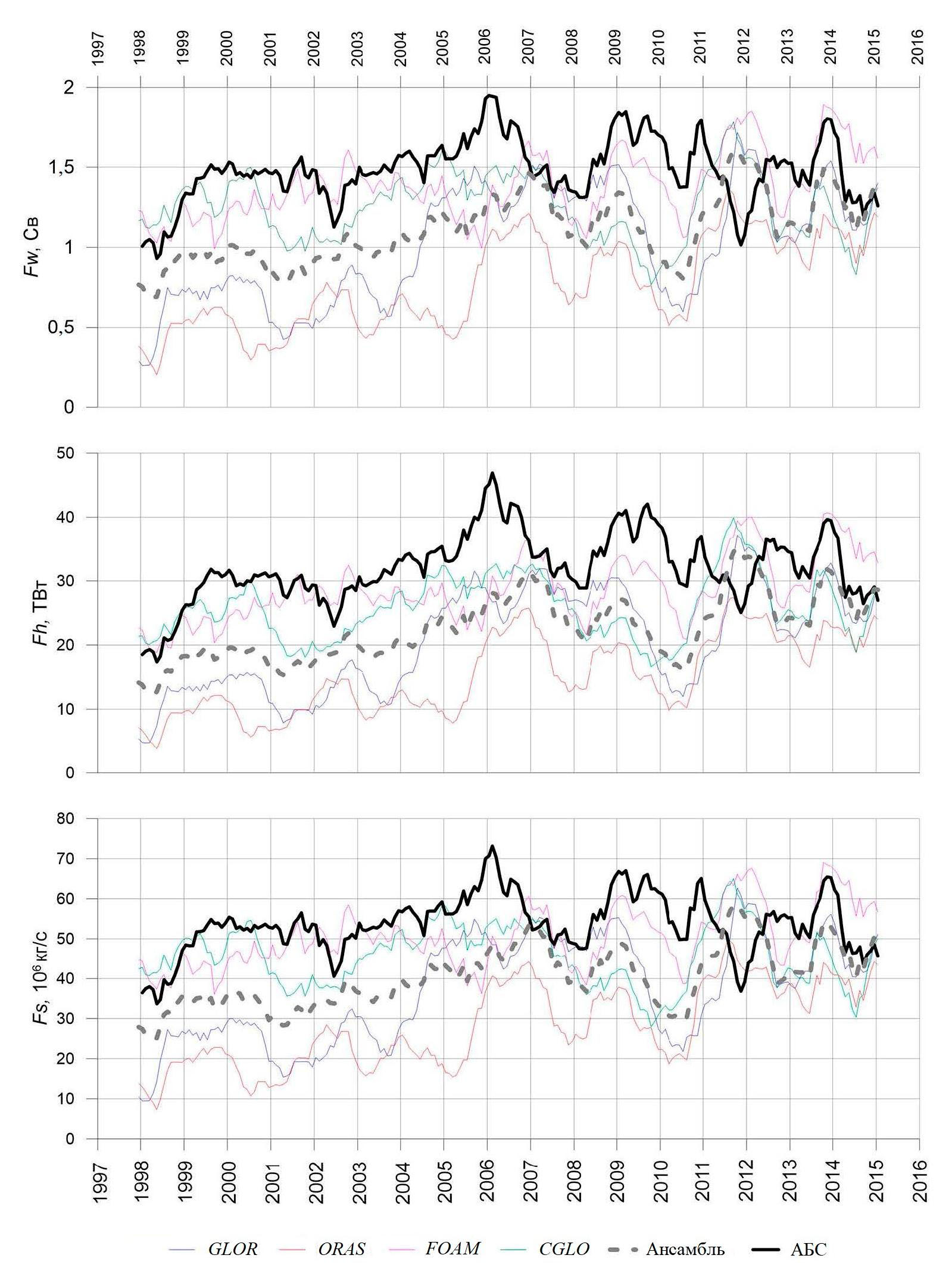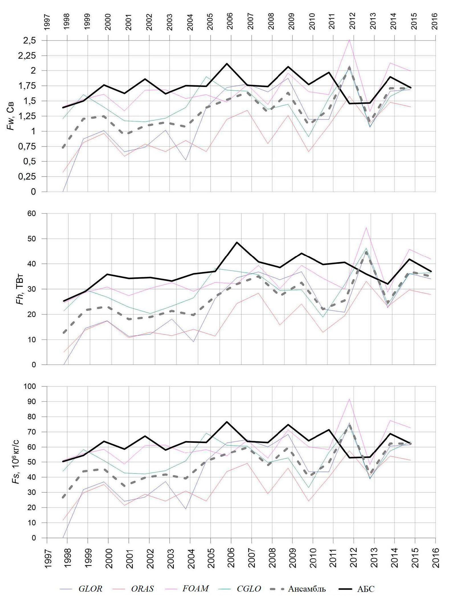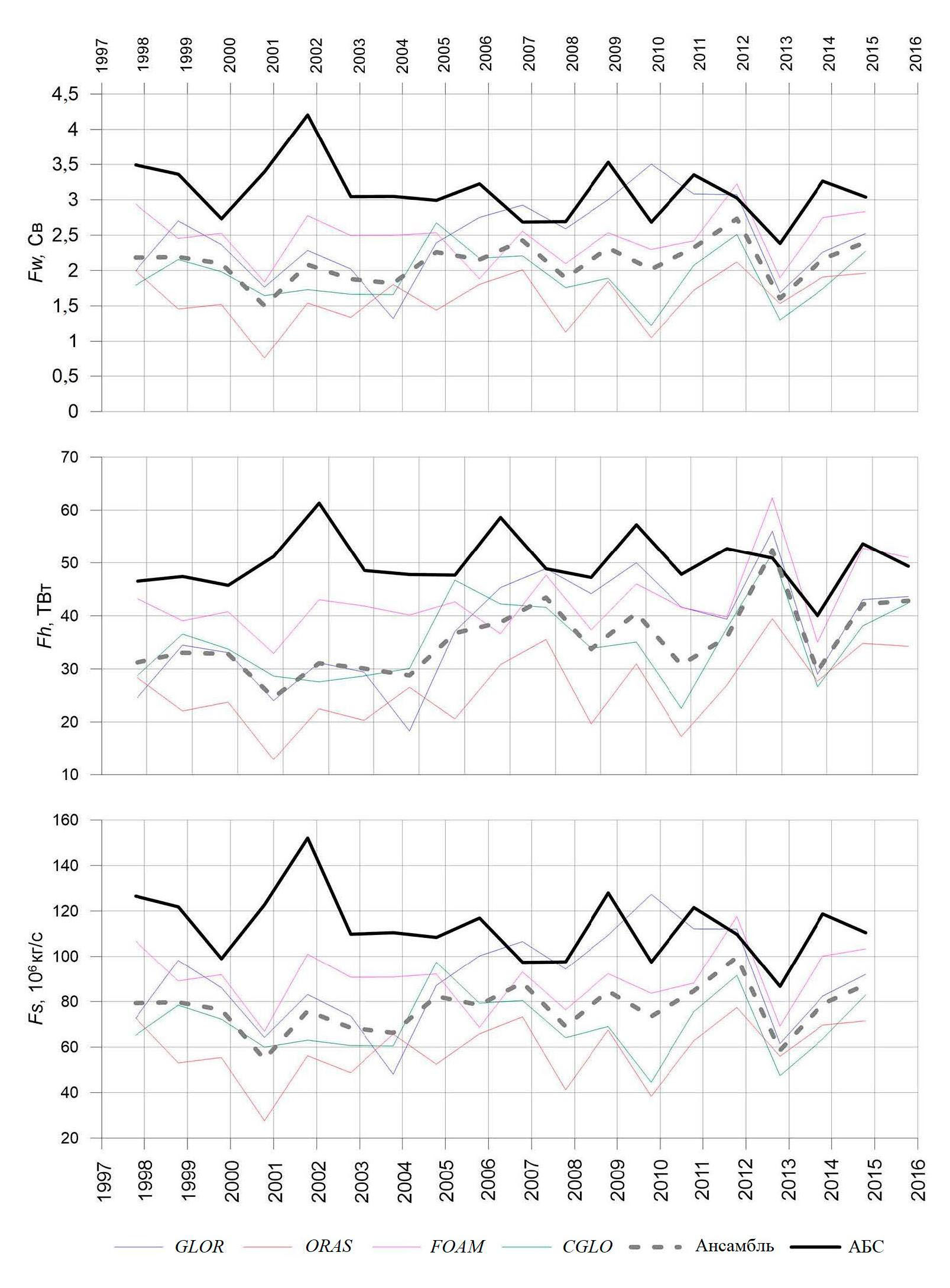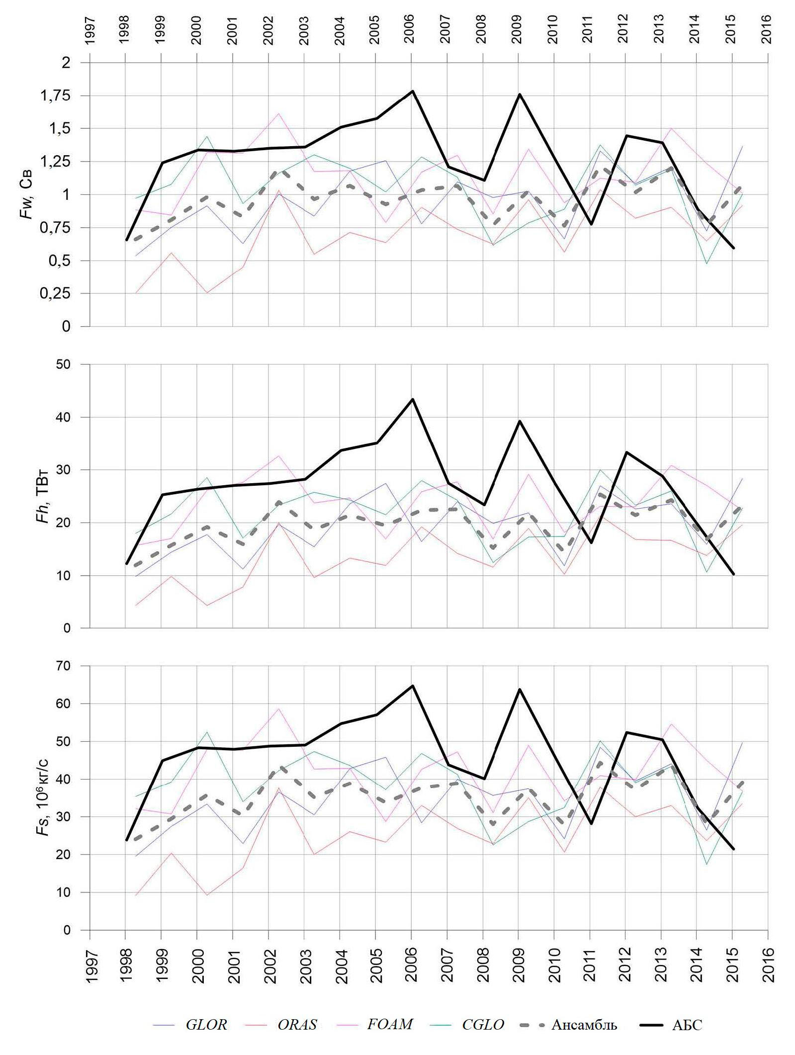 Из рис. 4 видно, что данные реанализов в целом занижают величину тепломассопереноса. Так, среднее значение переноса объема, по данным АБС, выше ансамблевого среднего более чем на 30 %, а его среднеквадратическое отклонение (СКО) – на 50 %. Аналогичная картина наблюдается в переносах тепла и соли (табл. 2).