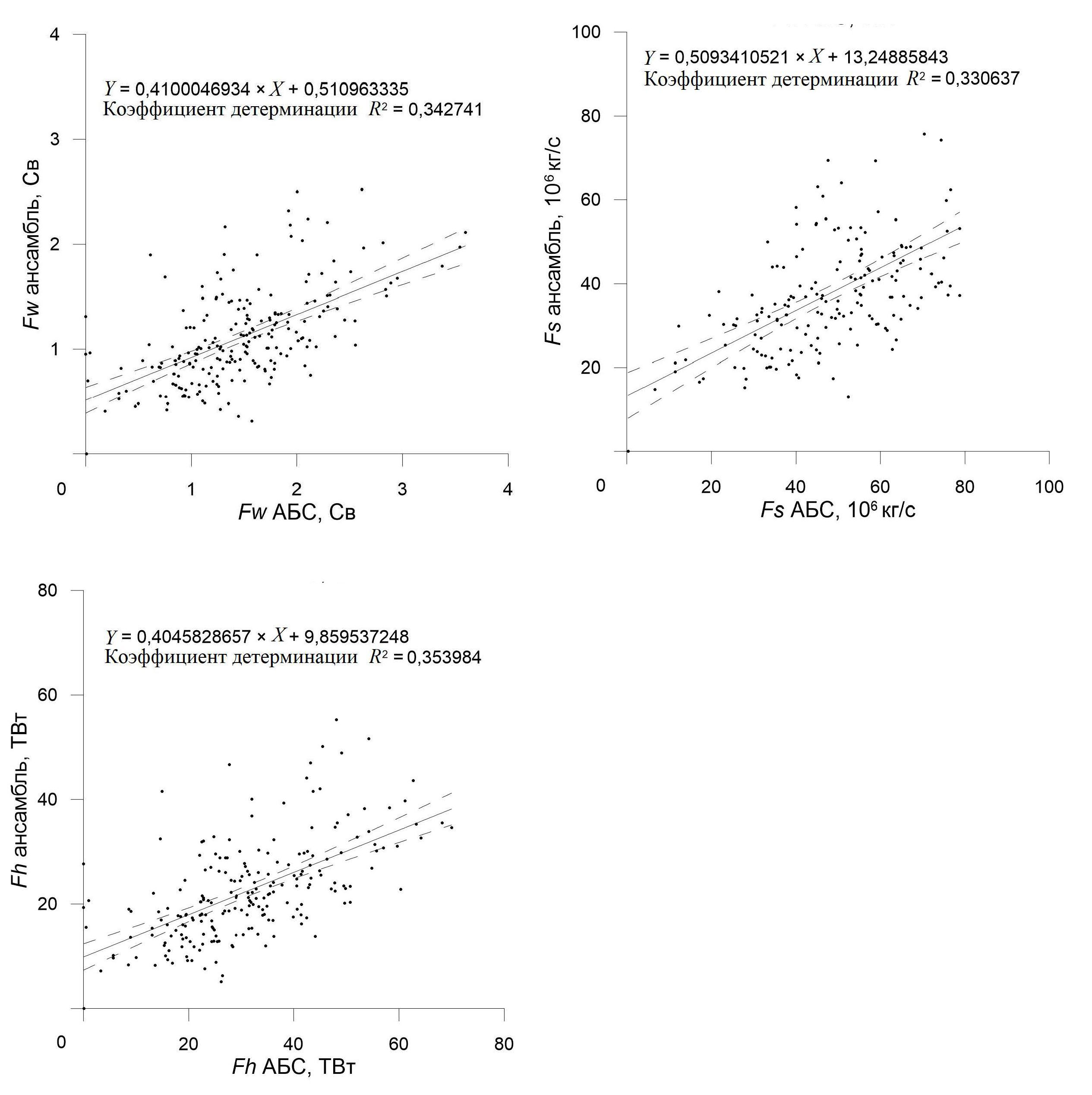 Рис. 8. Уравнения линейной регрессии между данными АБС и ансамблем моделей
