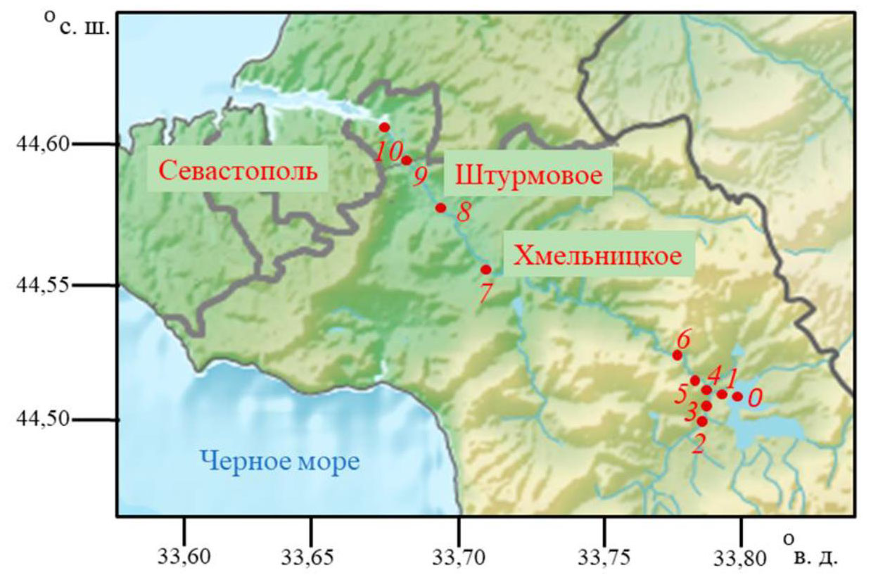 Fig. 1. Location of long-term monitoring stations of the Chernaya River: station 0 – reservoir mirror above the water intake; station 1 – water intake under the reservoir; station 2 – Baydarka River, former pond; station 3 – culvert under the road in the Ozernoe village; station 4 – the Urkusta River (tributary from the pond in the Peredovoye village); station 5 – automobile bridge between the villages Ozernoye and Peredovoe; station 6 – gauging station at the Red Rock; station 7 – gauging station by the Khmelnitskoe village; station 8 – automobile bridge by the Shturmovoe village; station 9 – railway bridge near Inkerman; station 10 – automobile bridge near Inkerman