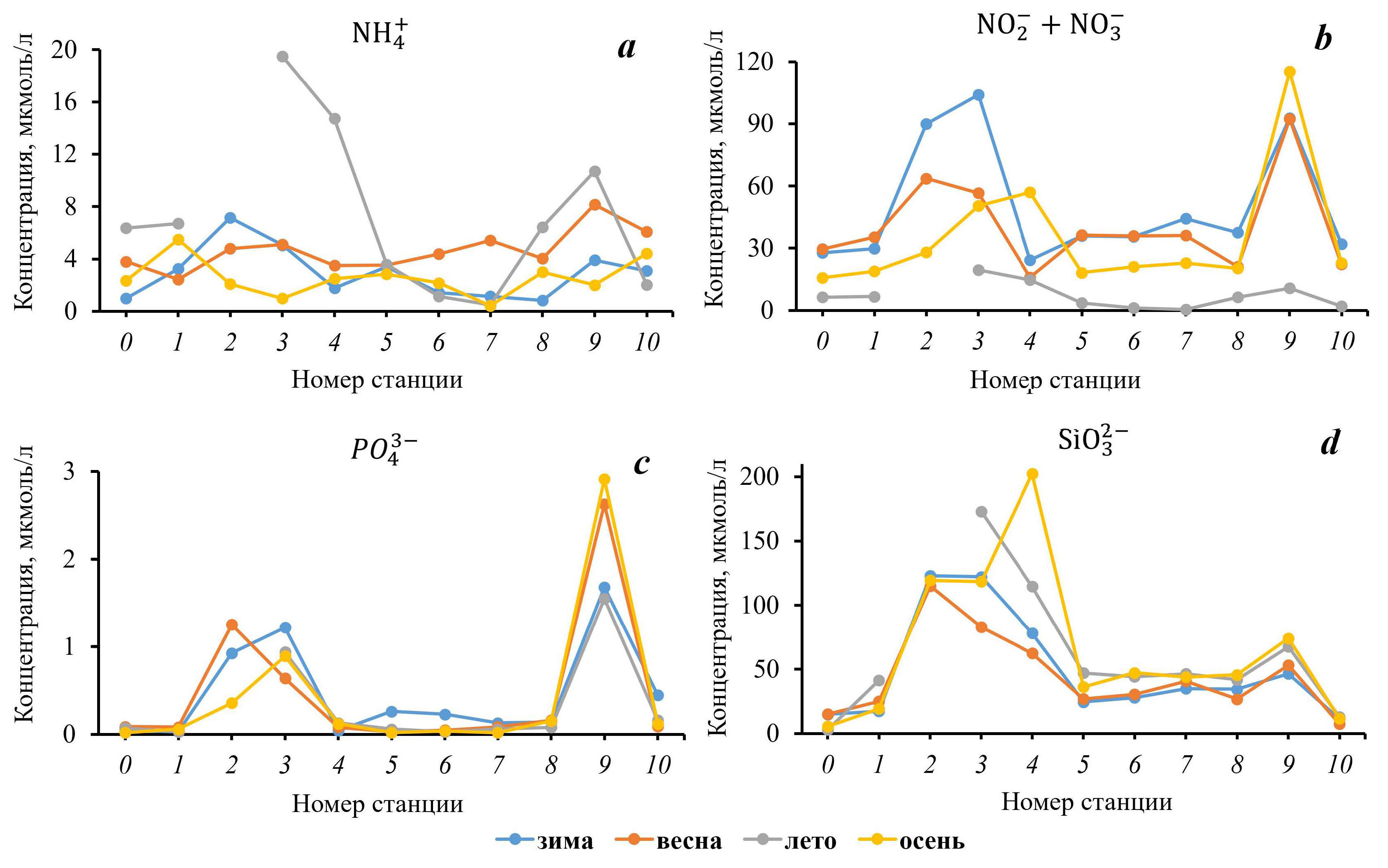 На протяжении всего исследуемого периода максимум содержания фосфатов отмечался на ст. 9 (рис. 2, c). Повышенные их концентрации определялись в течение всех сезонов в районе ст. 2, 3. Снижение содержания фосфатов по всему течению реки происходило в летний и осенний периоды.