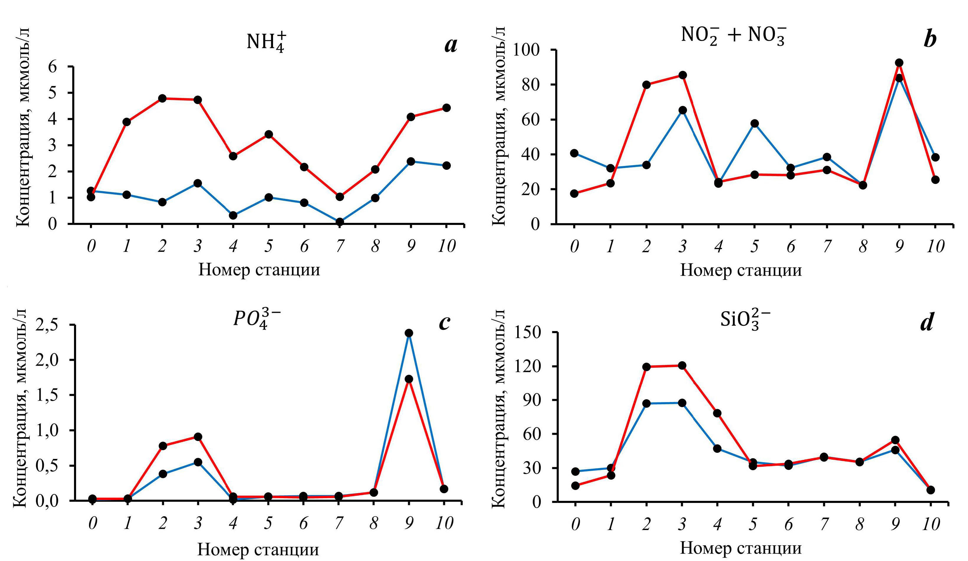 Повышенные концентрации кремнекислоты (рис. 2, d) наблюдались на ст. 2, 3, 4, а также на ст. 9. Максимальные значения отмечались в осенний период в притоке р. Уркусты (ст. 4), в который попадают стоки из села Передовое.