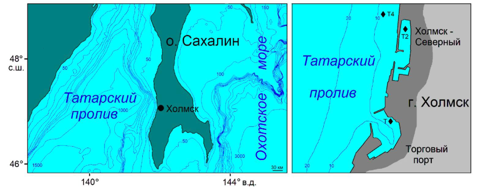 В бухтах г. Холмска (о. Сахалин) расположены порты Торговый и Холмск-Северный, которые имеют важное значение не только для города, но и для всего острова (рис. 1). Через Торговый порт осуществляется связь с материком паромной переправой Ванино – Холмск, по которой транспортируется большой объем самых разнообразных грузов. Акватории прилегающих к портам бухт хорошо защищены гидросооружениями разных видов от ветрового волнения [1]. Но для длинноволновых колебаний, приходящих из моря, такая защита неэффективна. К данному типу колебаний, в частности, относятся приливные, имеющие гармоники с периодами от суток до нескольких часов [2]. Также источником длинноволновых возмущений могут служить два принципиально разных типа процессов, приводящих к образованию длинных волн – анемобарических (АБ) и инфрагравитационных (ИГ) [3]. Анемобарические волны генерируются в результате воздействия флуктуаций атмосферного давления и ветра на поверхность моря, а также колебаний уровня, вызванных рассеянием энергии крупномасштабных длинноволновых образований типа метеоприливов или штормовых нагонов на неоднородностях рельефа и линии берега. Инфрагравитационные волны возникают в результате нелинейного взаимодействия ветровых волн или крупной зыби. Характерные периоды АБ-волн лежат в интервале от нескольких десятков секунд до нескольких часов, ИГ-волн – в интервале 30–300 с. Проникая на шельф и во внутреннюю акваторию, указанные волны возбуждают там резонансные сейшевые колебания.