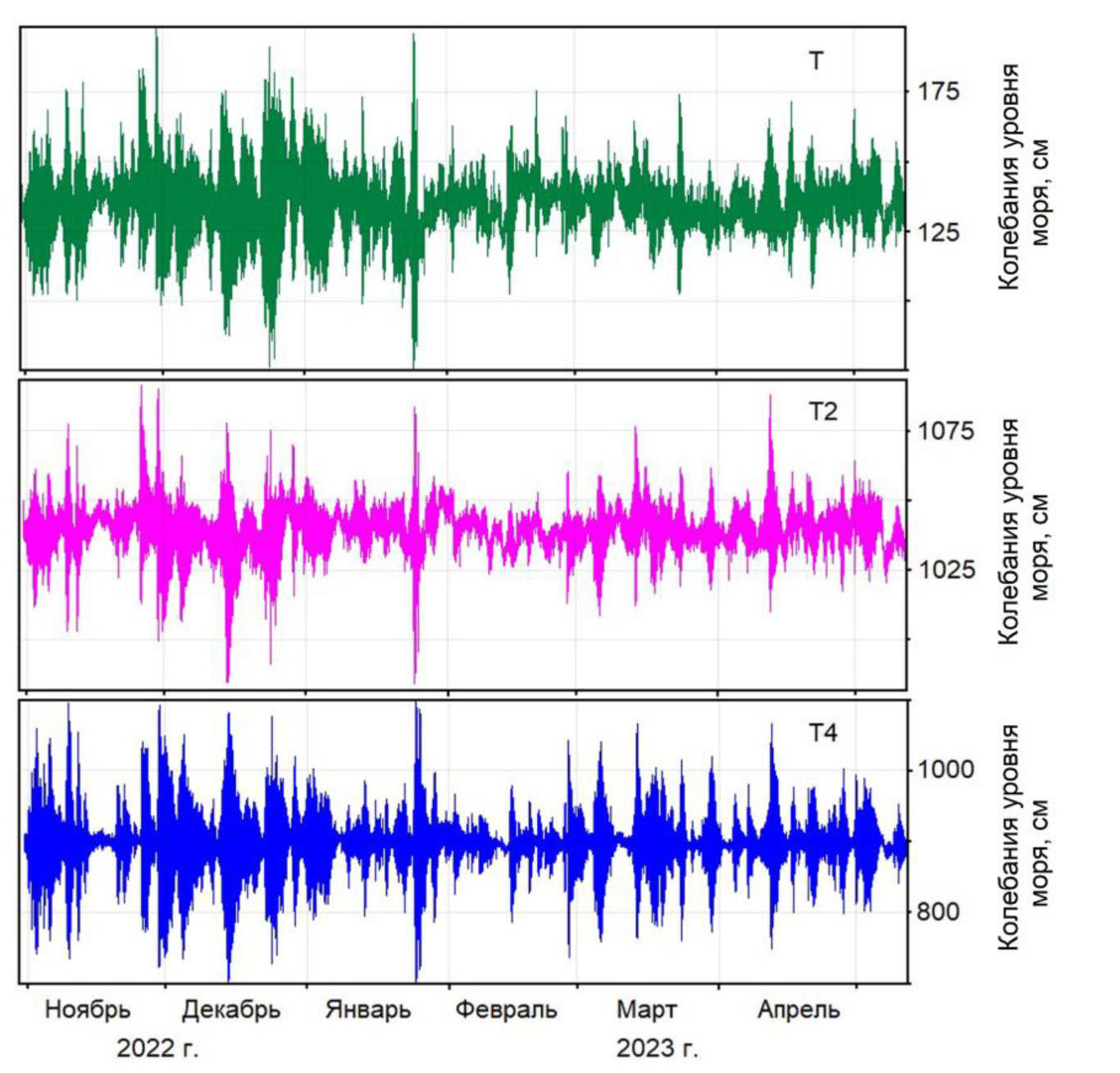 Fig. 2. Recorded time series of sea level oscillations from which the precalculated tide is subtracted. Here and in other figures, the device locations are shown: device T is installed in the Trade Port Bay, T2 – in the Kholmsk-Severny Bay, and T4 – in the Tatar Strait (on the shelf)