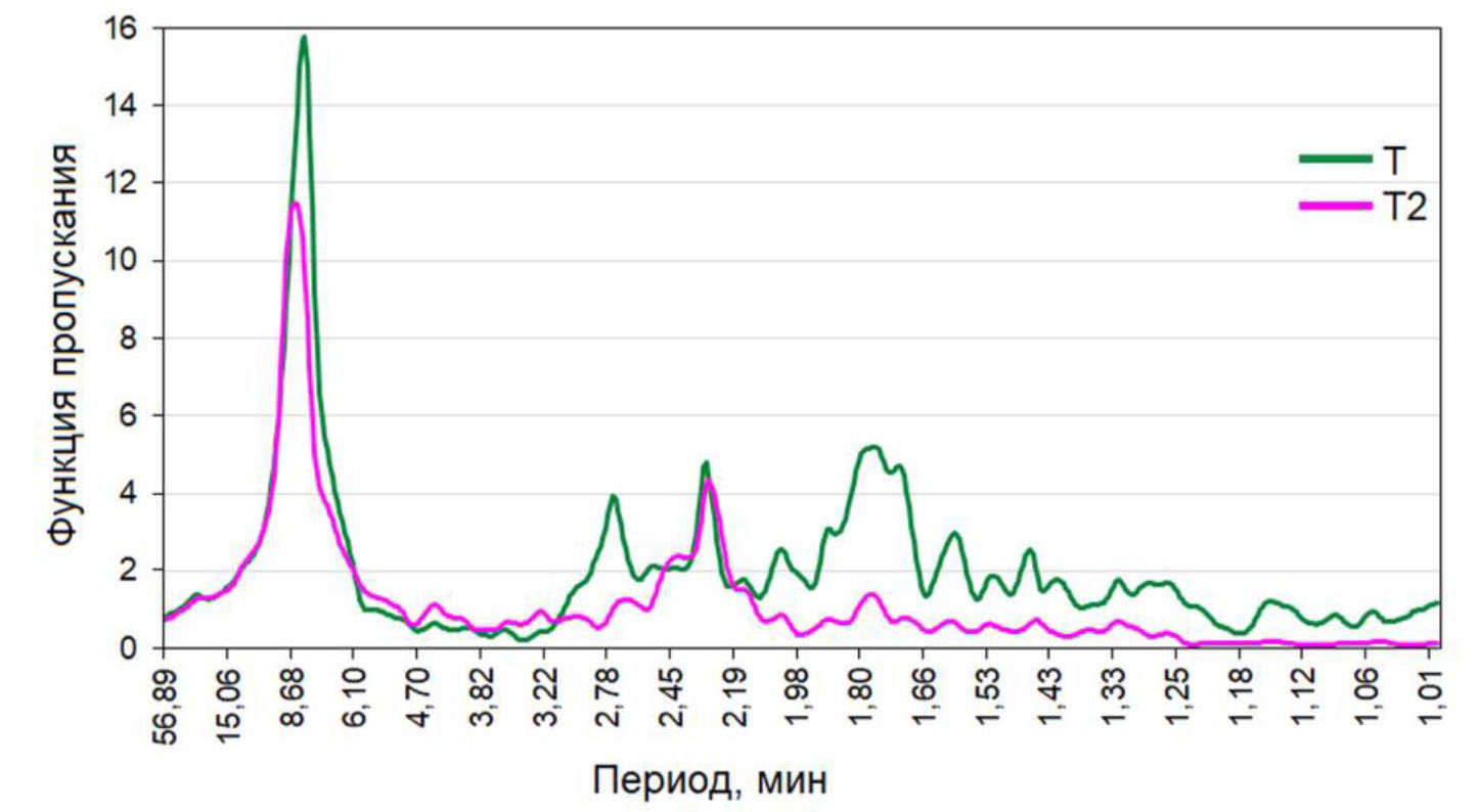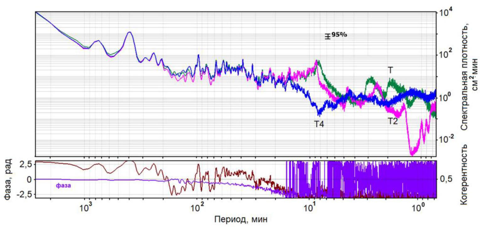 Отметим, что волновые процессы с периодами ~ 8 мин в открытой акватории Татарского пролива, в районе установки измерителя Т4, практически отсутствуют (рис. 4), поскольку в спектральной плотности наблюдается значительно выраженный минимум. В то же время в работе [19] отмечается, что источником длинноволновых колебаний с указанным периодом, регистрируемых на записях мареографа бухты Торгового порта, являются длинноволновые резонаторы, аккумулирующие и усиливающие энергию захваченных волн в районе о. Монерон и на шельфе вблизи г. Чехов. Численное моделирование резонансных колебаний в бухте Торгового порта, согласно указанной работе, не показало наличие интенсивных колебаний на периодах ~ 8 мин.