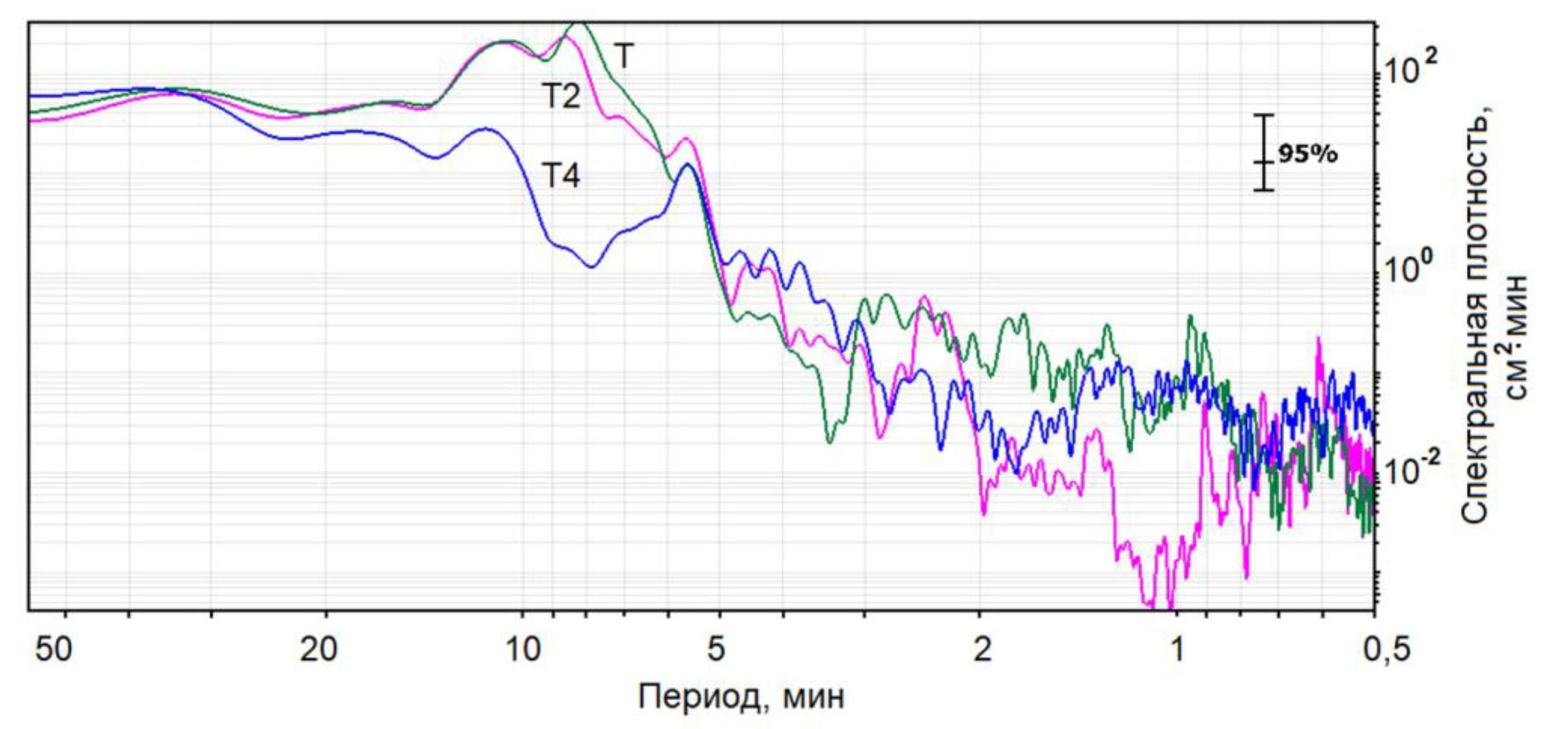 Для рассматриваемых отрезков временных рядов (рис. 5) рассчитаны спектральные плотности колебаний уровня моря, приведенные на рис. 7. Эти более детальные графики показывают наличие пиков на периоде 5,62 мин для всех измерителей, а также на периодах 8,17 и 10,5 мин – для измерителя Т, на периодах 8,65 и 10,92 мин – для измерителя Т2 и на периоде 11,37 мин – для измерителя Т4. Для периодов ~ 8 мин в спектральной плотности колебаний уровня, рассчитанной по данным измерителя Т4, наблюдается существенный минимум.