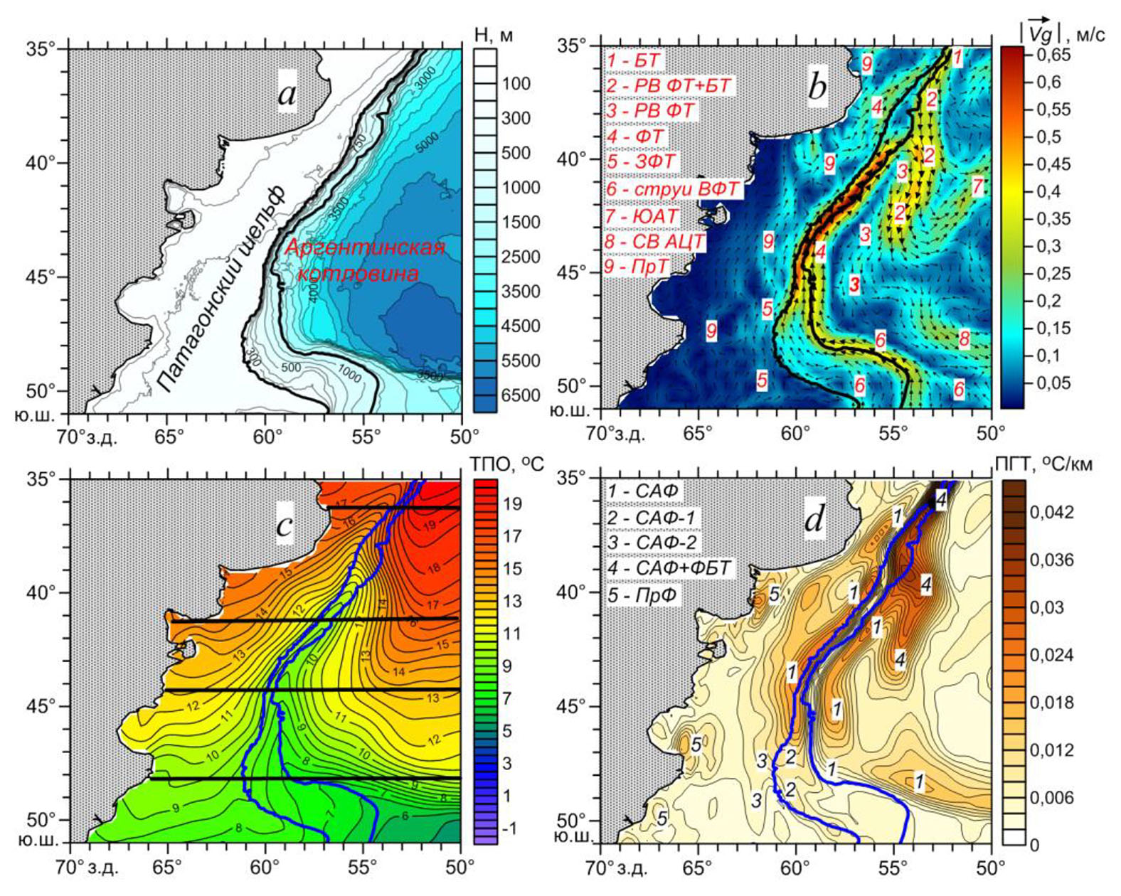 На юго-западной периферии меандра южнее 45° ю. ш. выделены три фронта, которые мы идентифицируем как ветви САФ. Наиболее интенсивная из них восточная ветвь (собственно САФ) проходит примерно на 0,5° западнее основной струи ВФТ над изобатами 900–1000 м. Более слабая центральная ветвь (САФ-1) располагается в пределах потока ВФТ-1 над изобатами 300–400 м. Западная ветвь (САФ-2) практически совпадает со струей ЗФТ и прослеживается над изобатами 130–150 м (рис. 2, a). Севернее 45° ю. ш., где западная периферия меандра формируется одним потоком ФТ, САФ также представлен одной ветвью. Здесь фронт располагается примерно на 0,25° западнее потока ФТ над изобатами 150–170 м (рис. 2, b). В северо-западной части меандра САФ проходит над изобатой 100 м, при этом смещение его положения на запад относительно положения стрежня ФТ постепенно увеличивается и на широте 41° ю. ш. достигает 0,5° (рис. 2, c). Ближе к зоне схождения Фолклендского и Бразильского течений САФ располагается над глубинами 50–60 м, заметно ослабевает и смещается к западу относительно ФТ почти на 1° (рис. 2, d). На северо-восточной периферии циклонического меандра, которую образует общий поток РВ ФТ+БТ, в поле ТПО наблюдается интенсивный фронт, формирующийся в результате схождения Субантарктического фронта и Фронта Бразильского течения (САФ+ФБТ). Этот фронт проходит над изобатами 800–1000 м и практически совпадает по положению со стрежнем РВ ФТ+БТ (рис. 2, d). Примерно до 39–40° ю. ш. САФ+ФБТ разделяет холодные воды, переносимые ФТ, и теплые воды, переносимые потоком РВ ФТ+БТ. На восточной периферии меандра южнее 40° ю. ш. наблюдается широкая зона высоких значений ЗГТ, в пределах которой к западу от основного максимума ЗГТ, соответствующего САФ+ФБТ, выделяется еще один максимум ЗГТ, соответствующий еще одной ветви САФ (рис. 2, c). Формирование двух температурных фронтов на данном участке меандра связано с двумя потоками южного направления (рециркуляция ФТ и общий поток РВ ФТ+БТ). Здесь САФ отделяет наиболее холодные воды, переносимые ФТ с юга, от более теплых вод, поступающих с севера с рециркуляцией ФТ, а САФ+ФБТ, в свою очередь, отделяет последние от еще более теплых вод, переносимых РВ ФТ+БТ. Ветвь САФ+ФБТ практически совпадает по положению со стрежнем РВ ФТ+БТ, а САФ смещен к западу от струи РВ ФТ почти на 1° (рис. 2, c). Эти два фронта (САФ и САФ+ФБТ) сохраняются примерно до 45° ю. ш., при этом САФ прослеживается над материковым склоном вдоль изобат 1000–2500 м и постепенно усиливается в южном направлении, а САФ+ФБТ проходит над глубинами более 4000 м и, наоборот, постепенно ослабевает (рис. 2, b, c). Отметим, что выделение двух ветвей САФ на восточной периферии меандра между 40° и 45° ю. ш. позволило уточнить результаты более ранней работы [14], в которой отмечалось существование к югу от 40° ю. ш. одного температурного мористого фронта, характеризующегося слабыми положительными градиентами ТПО.