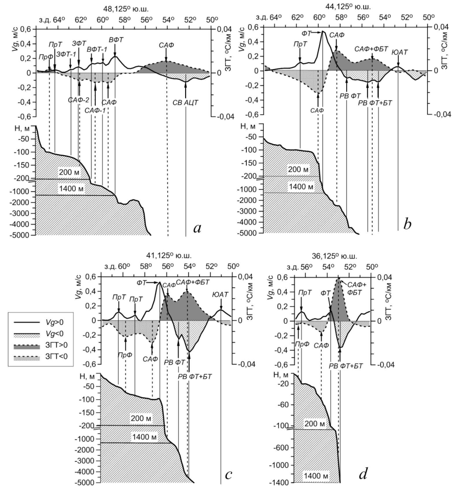 3. Fig. 2. Distributions of long-term average values of ZTG (dashed curves) and Vg (solid curves) along 48.125° S (a), 44.125° S (b), 41.125° S (c) and 36.125° S (d) against the background of bottom profile (shaded). Positions of temperature fronts are shown by dashed lines, and those of current jets – by solid ones