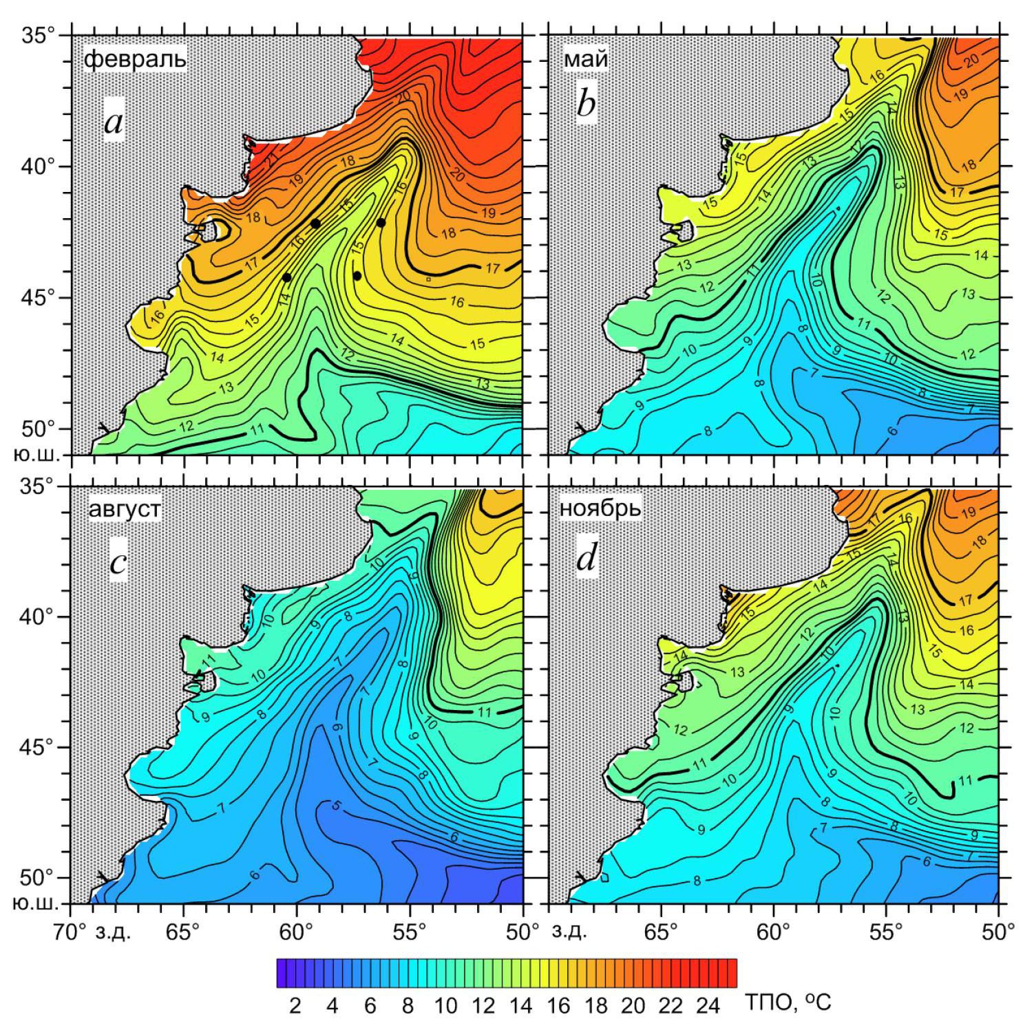5. Fig. 4. Distributions of the climatic monthly average SST values in February (a), May (b), August (c) and November (d). Bold lines denote the 11°С and 17°С isotherms