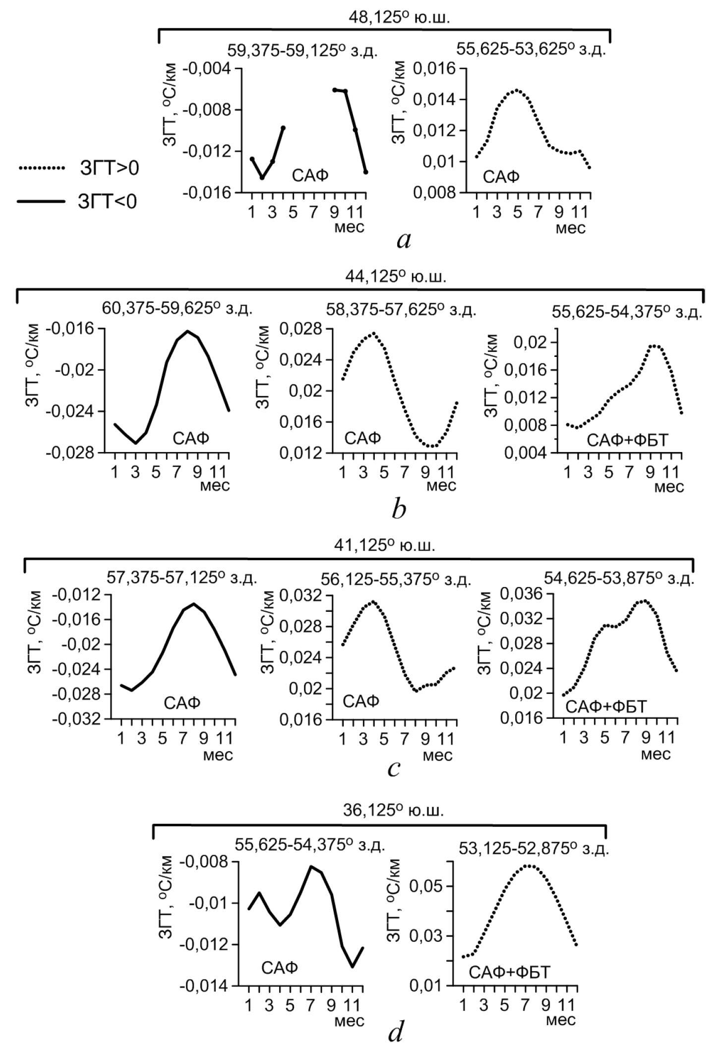 Распределения климатических среднемесячных зональных градиентов ТПО показали, что под влиянием рельефа дна ветви САФ, особенно на западной периферии меандра, имеют устойчивое положение, их внутригодовые смещения по долготе не превышают 1° (рис. 5, 6). Вместе с тем внутригодовые изменения интенсивности ветвей САФ заметно различаются на разных участках акватории: на юге их значения не превышают 0,012°С/км (рис. 6, a), севернее 45° ю. ш. они увеличиваются до 0,016–0,02°С/км (рис. 6, b, c), у вершины меандра снова уменьшаются и на 35–36° ю. ш. составляют 0,006°С/км (рис. 6, d). Значения сезонных изменений интенсивности САФ+ФБТ уменьшаются в южном направлении от 0,04–0,05°С/км на 35–36° ю. ш. до 0,012°С/км на 44° ю. ш. (рис. 6, bd).