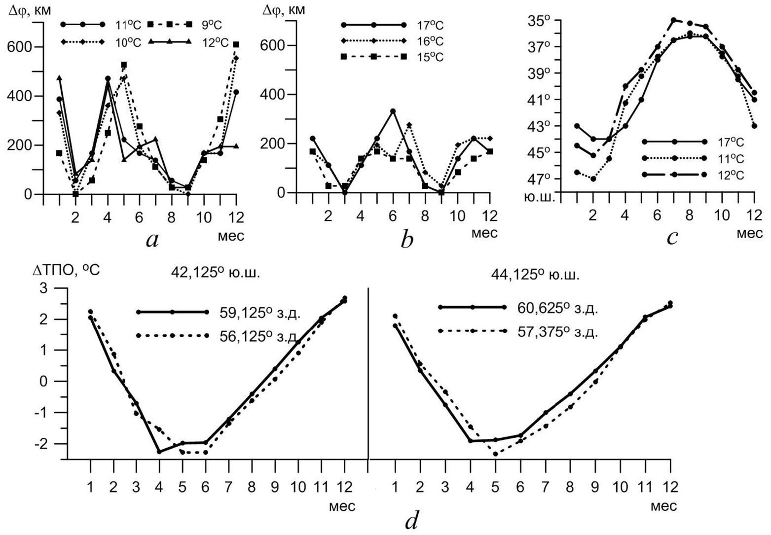 9. Fig. 8. Displacement (along the latitude) speed (km/month) of different isotherms in the tongues of cold (a) and warm (b) waters; extreme northern position of the 11°С and 12°С isotherms in the cold water tongue, and extreme southern position of the 17°С isotherm in the warm water tongue for each month (c); ΔSST intra-annual cycle in certain grid knots (shown by points in Fig. 4, a) at the western (solid curves) and eastern (dotted curves) meander peripheries (d)