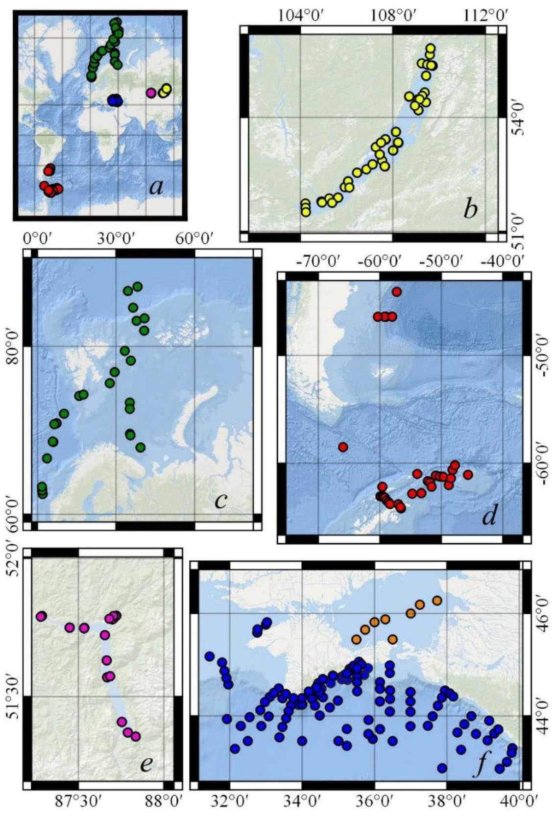 Рис. 1. Расположение станций (обозначены цветными кружками) в исследуемых районах Мирового океана (а); увеличенное изображение исследуемых районов: b – озера Байкал (желтый цвет), c – Баренцева, Норвежского морей и Северного Ледовитого океана (зеленый цвет), d –Атлантического сектора Южного океана (красный цвет), e – Телецкого озера (лиловый цвет), f – Черного (синий цвет) и Азовского (коричневый цвет) морей