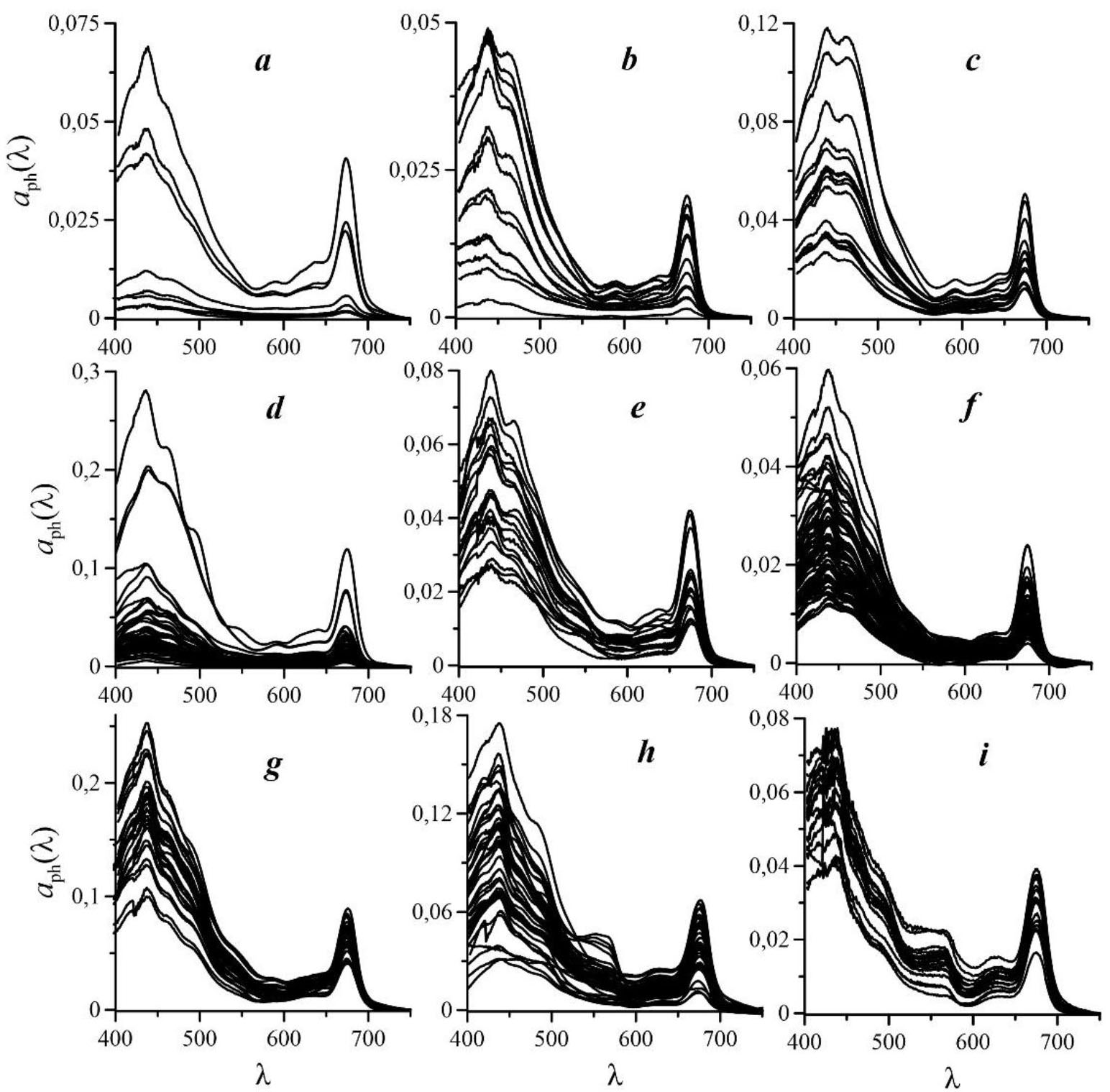 F i g. 2. Spectra of light absorption coefficients by phytoplankton (aph(λ)) in the surface layers of the Arctic Ocean (a), the Barents (b) and Norwegian (c) seas, Atlantic sector of the Southern Ocean (d), the Black Sea in winter (e) and summer (f), the Sea of Azov (g), and the Baikal (h) and Teletskoye (i) lakes