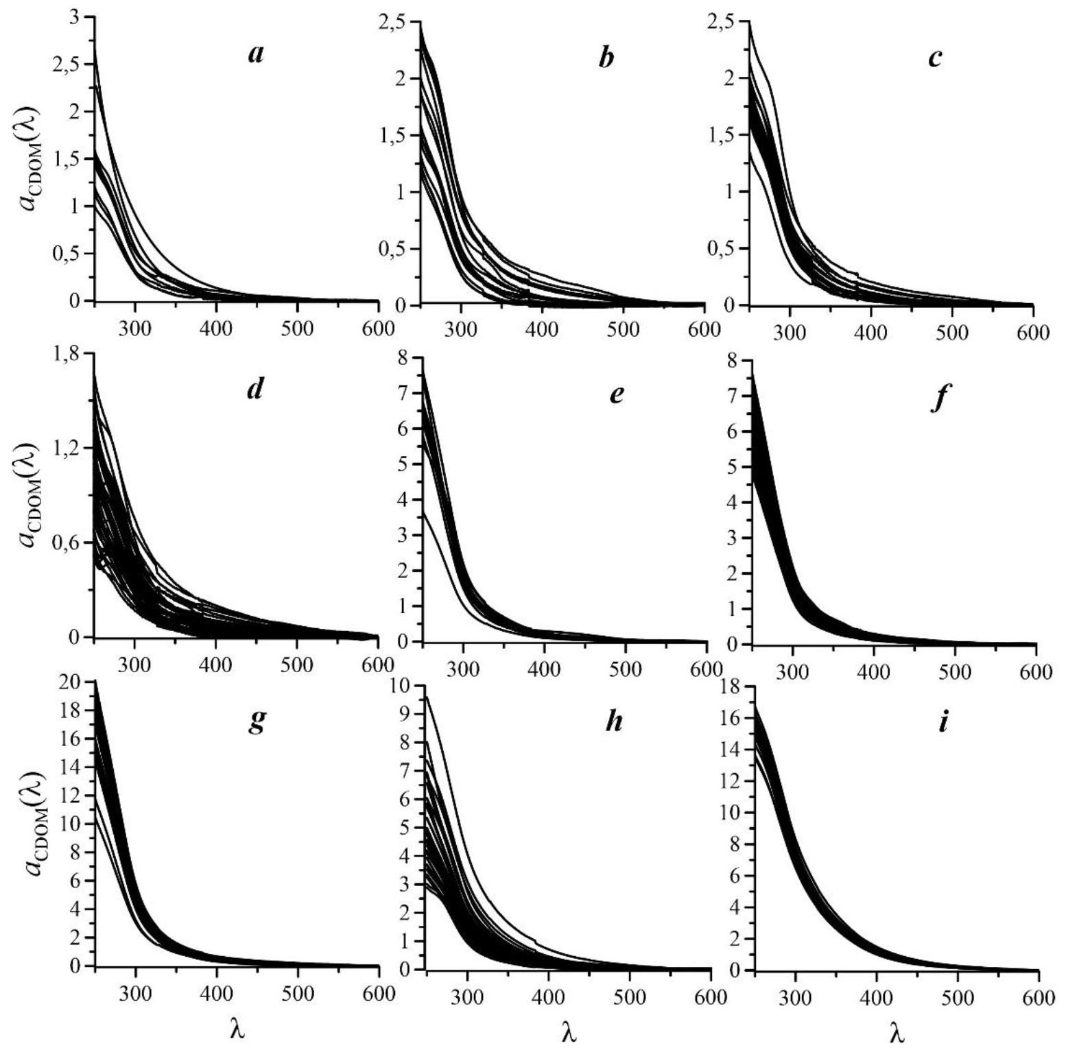 Рис. 4. Спектры показателей поглощения света окрашенным растворенным органическим веществом (aCDOM(λ)) в поверхностном слое вод Северного Ледовитого океана (a), Баренцева моря (b), Норвежского моря (c), Атлантического сектора Южного океана (d), Черного моря зимой (e) и летом (f), Азовского моря (g), озера Байкал (h), Телецкого озера (i)
