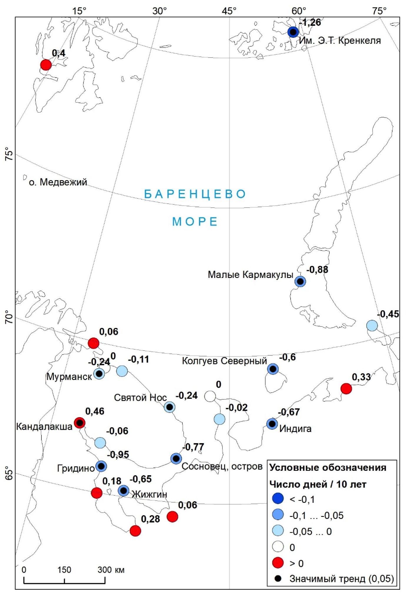 Из карты следует, что отрицательные тренды наблюдаются в основном на территориях, выходящих к побережьям Белого и Баренцева моря. Положительные тренды, как правило, наблюдаются на метеорологических станциях, имеющих более континентальное расположение. Почти все значимые тренды имеют отрицательный знак. Исключением является метеорологическая станция «Кандалакша», где наибольший вклад в положительный тренд вносит мокрый снег.