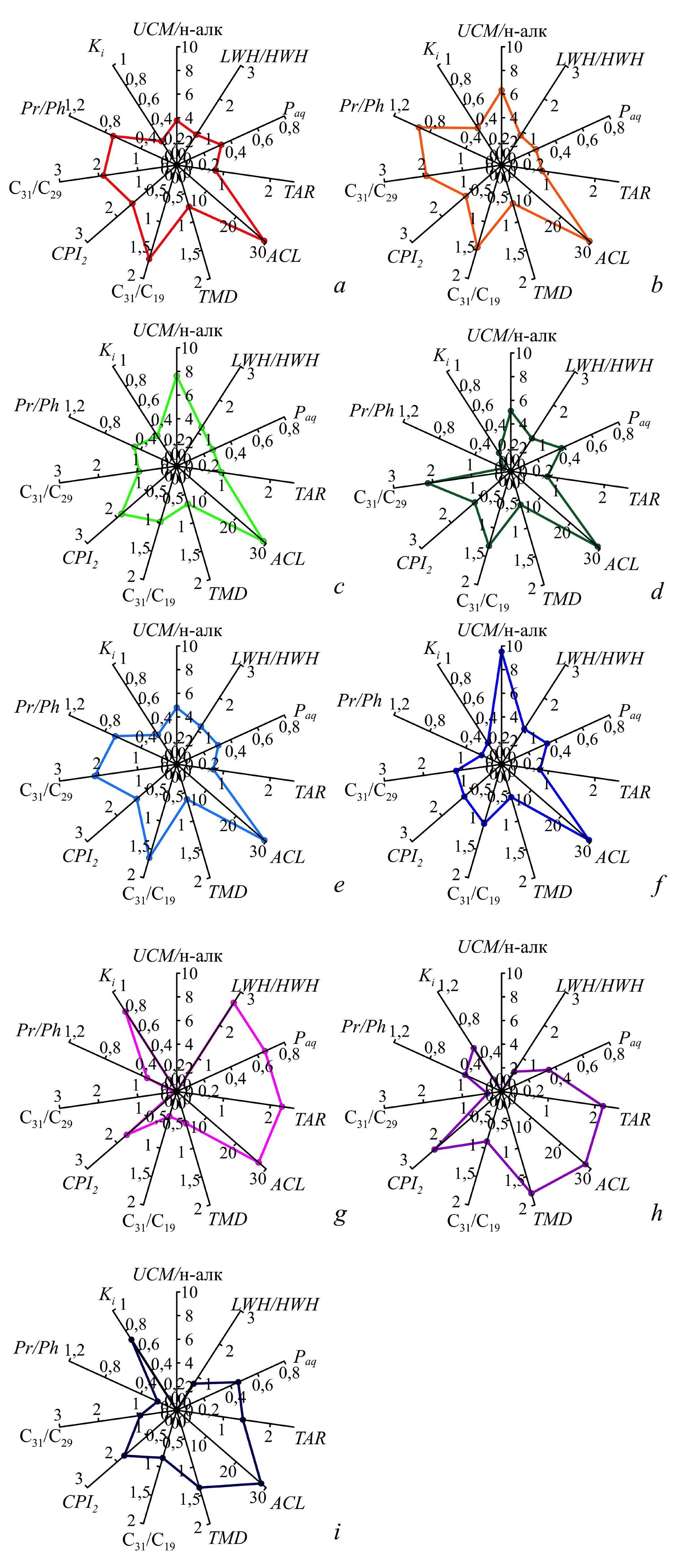 В данной работе оценка вероятного происхождения углеводородов производилась на основании значения следующих маркеров: Pr/Ph, Ki, UCM/н-алканы, LWH/HWH, Paq, TAR, ACL, TMD, C31/C19, CPI2, C31/C29 [10–17]. Расчет данных индексов производился по следующим формулам [10–17], представленным в табл. 1.