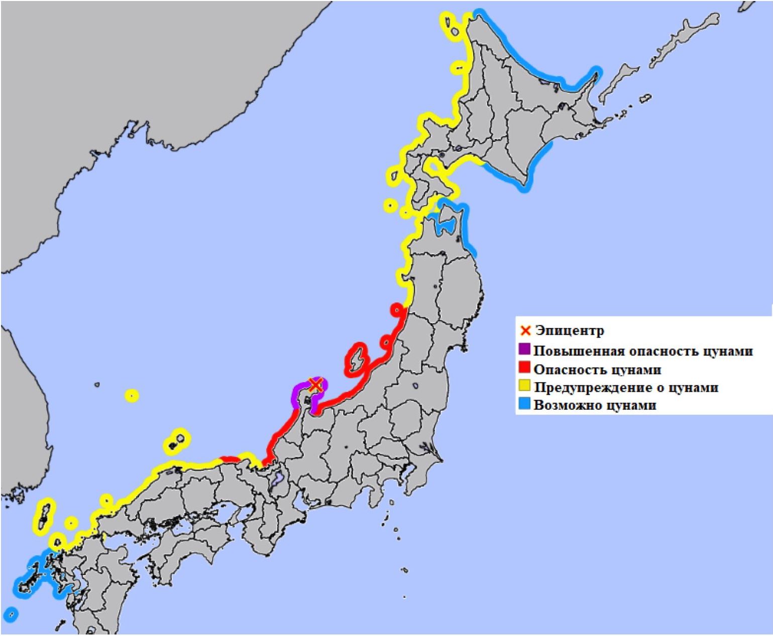 Мы рассматриваем сильное землетрясение (М = 7,6), произошедшее 1 января 2024 г. на п-ове Ното в префектуре Исикава, Япония. В результате серии подземных толчков были вызваны массовые разрушения в городах Судзу, Ваджима, Ното и Анамидзу. При этом в соседних префектурах Тояма и Ниигата также зафиксирован значительный ущерб. В результате этого землетрясения в ряде регионов о-ва Хонсю была объявлена угроза цунами. Японским метеорологическим агентством была выпущена карта предупреждения о цунами, по которой, предположительно, к западному побережью острова волны цунами должны были подойти высотой 5 м (рис. 1).