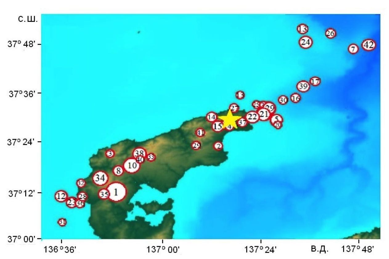 Р и с. 2. Афтершоки после землетрясения 01.01.2024 на п-ове Ното (желтая звездочка – эпи-центр землетрясения; кружки с цифрами обозначают порядок афтершоков 5)