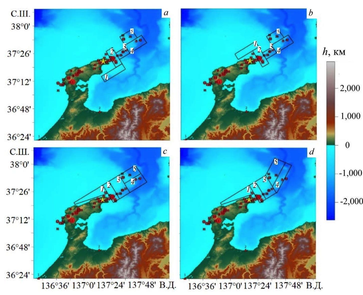 В работе было рассмотрено четыре сценария с разной локализацией очага землетрясения (рис. 4). На рис. 4, а приведен сценарий 1 с блоком 2 в районе зал. Тояма (Toyama bay) к юго-востоку от п-ова Ното. На рис. 4, b такой же блок расположен в Японском море к северо-западу от п-ова Ното. Расположение остальных блоков в очаге землетрясения для этих сценариев аналогично. Для cценария 3 локализация очага изображена на рис. 4, c. Можно видеть, что блок, расположенный к северо-западу от полуострова, принял треугольную форму, протянутую вдоль всего полуострова. Форма остальных блоков также изменилась. В сценарии 4 форма блоков 1–3 не изменилась, но изменилось направление расположения блоков 4 и 5. Такое изменение локализации, размеров и ориентации блоков связано со сравнением результатов моделирования с натурными данными и данными других авторов. Всего было проведено 14 вариантов моделирования, 4 из которых будут приведены в данной работе.
