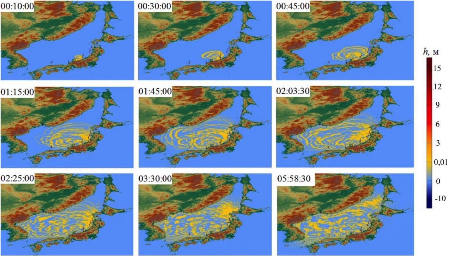 На рис. 6 приведено положение волновых фронтов для девяти моментов времени. Хорошо видно, что спустя 10 мин после начала генерации волны высотой 1 м доходят до о. Садо, причем волны двигаются в эту сторону быстрее, чем в сторону залива, что связано с глубоководной впадиной Тояма. По истечении 30 мин волновой фронт достиг прибрежных городов Кашивазаки и Тояма. На 45-й минуте волновой фронт высотой 0,5 м достиг северной части о. Хонсю и огибает п-ов Ното. Спустя 1 ч 45 мин после землетрясения волны высотой ~ 20 см достигают г. Владивостока и южной части о. Хоккайдо. В 5:56:30 волновой фронт достиг г. Холмса, расположенного в северной части о. Сахалин.