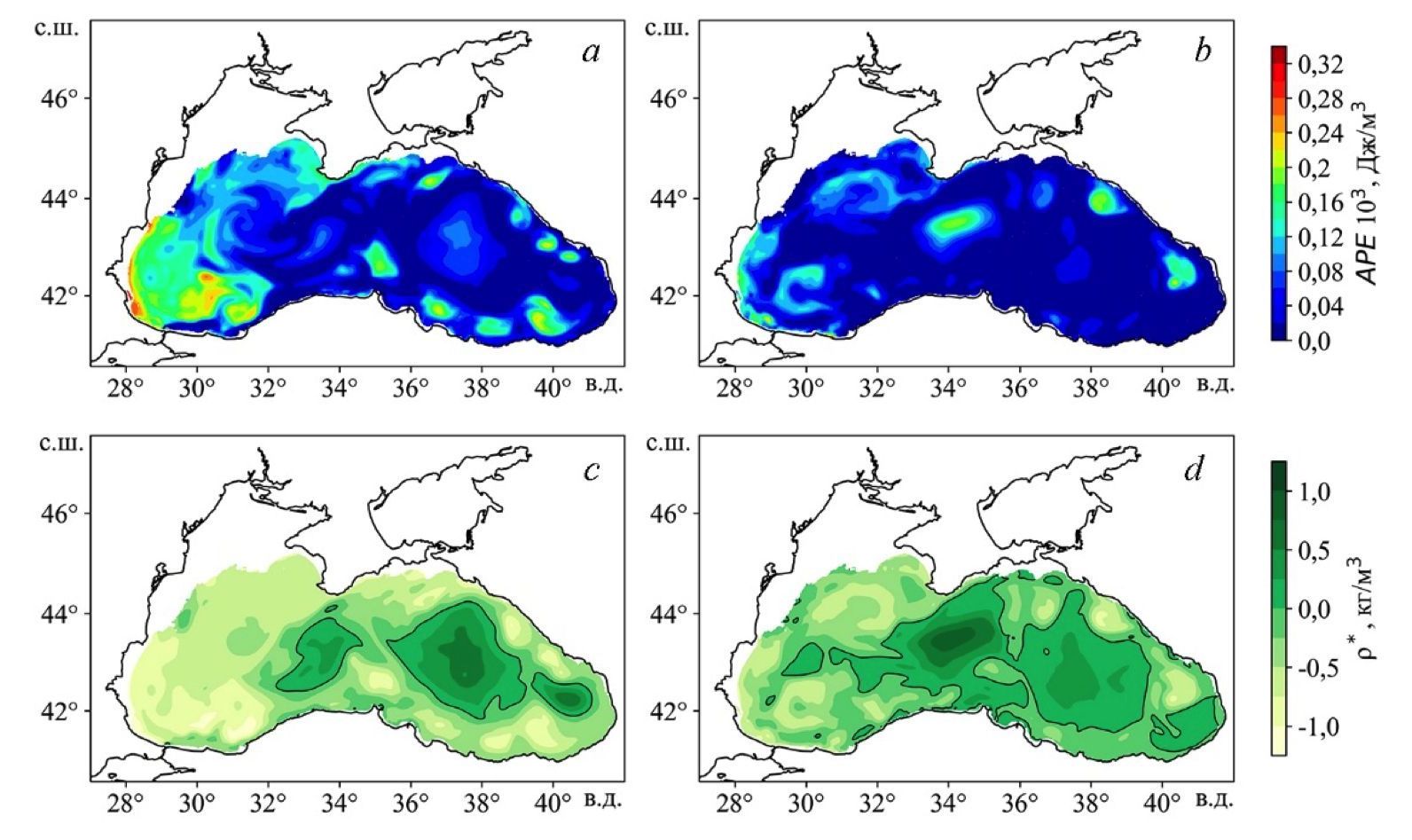 Для зимнего периода получено, что наибольшие различия между значениями ДПЭ в двух экспериментах наблюдаются в слое 40–100 м (рис. 2, b). Чтобы выявить причины этих различий были проанализированы карты полей АРЕ и аномалии плотности на горизонтах 50, 75 и 100 м. Как видно из рис. 5, в эксперименте 1 повышенные значения АРЕ наблюдаются на периферии бассейна в западной части моря (рис. 5, a) и эти области пространственно соответствуют отрицательным аномалиям плотности (рис. 5, c) в антициклонических вихрях. Также видно, что пространственная структура полей аномалии плотности в эксперименте 2 (рис. 5, d) существенно отличается от данных эксперимента 1 (рис. 5, c).