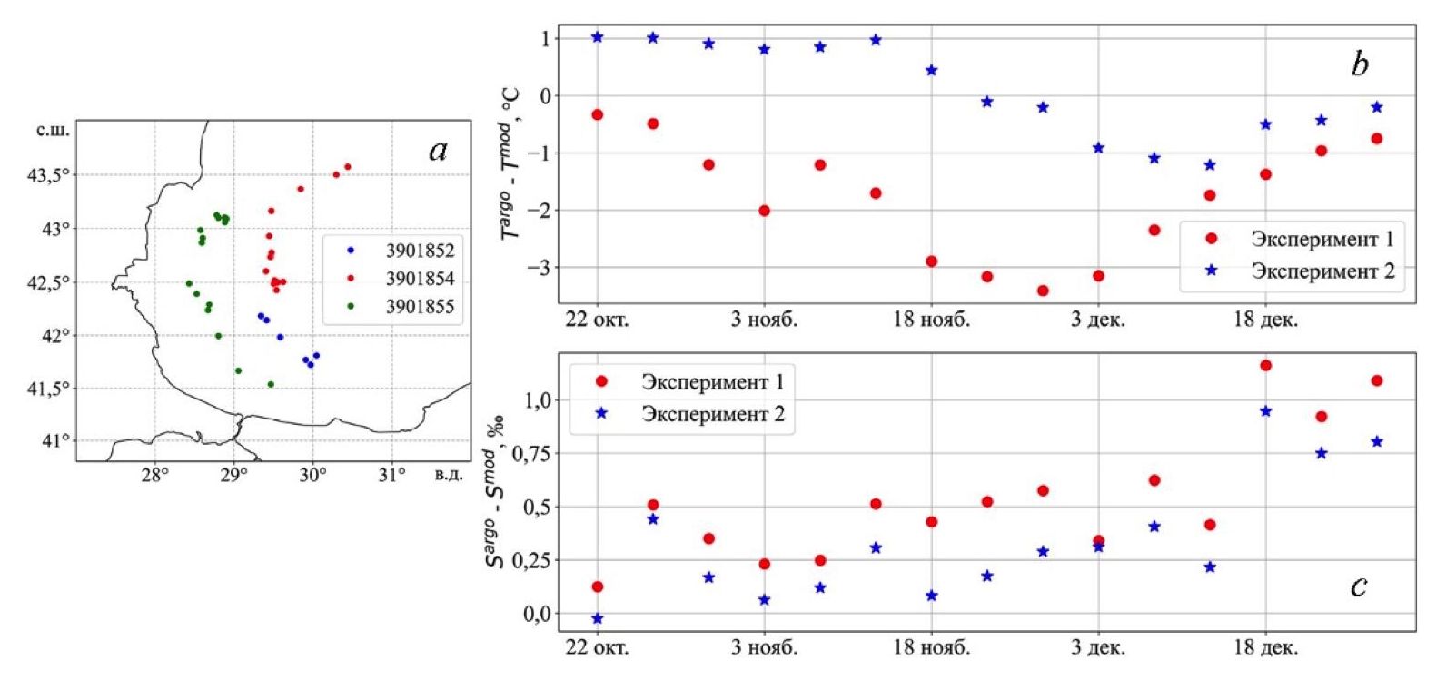 Поэтому в зимний период дополнительно была проведена оценка изменения со временем отклонения температуры и солености от данных измерений для юго-западной части моря на глубинах 50–100 м. Были рассмотрены три буя-профилемера Argo № 3901852, 3901854, 3901855 (карта расположения станций профилирования показана на рис. 6, a). На рис. 6, b и c представлены величины отклонений модельных данных от измеренных на горизонте 75 м. Среднее за период 22.10.2016–28.12.2016 отклонение температуры составило −1,7 и +0,1 °С; отклонение солености 0,5 и 0,3 ‰ для экспериментов 1 и 2 соответственно. Как видно для указанных буев в эксперименте 2 отклонения термохалинных характеристик уменьшаются. Следовательно, данные восстановлены точнее, чем в эксперименте 1. Таким образом, для зимнего сезона 2016 г. оценки ДПЭ, полученные с использованием схем аппроксимации (2), (3), являются более адекватными реальной энергетике циркуляции.
