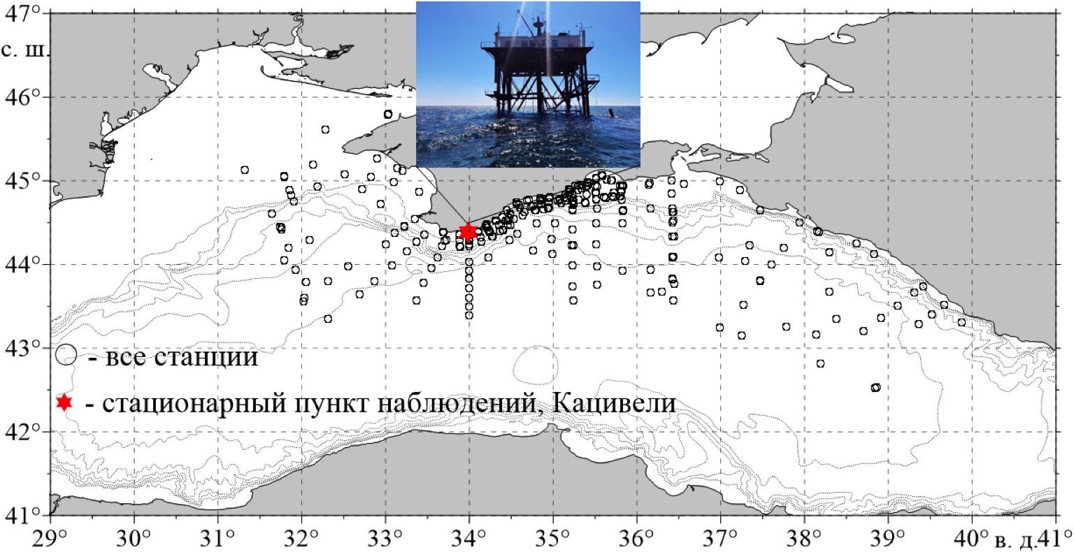 В работе использовались данные натурных измерений двух разных типов. Во-первых, данные судовых измерений рСО2 поверхностного слоя вод, выполненных на НИС «Профессор Водяницкий» (рейсы № 81, 87, 89, 91, 94, 95, 98, 101, 102, 108, 114, 117, 119, 125, 126) в период с ноября 2015 г. по март 2023 г. и охватывающих все гидрологические сезоны, за исключением зимнего периода (январь, февраль). Во-вторых, данные измерений, полученные с мая 2012 г. по октябрь 2022 г. на стационарном пункте наблюдений за потоком углекислого газа, расположенном на океанографической платформе Черноморского гидрофизического подспутникового полигона (ЧГПП, пгт Кацивели). С учетом принципиально разных условий проведения измерений (их частоты в пространственно-временном масштабе, а также удаленности от берега) судовые данные и данные, полученные на платформе, обрабатывались отдельно. Район исследования и схема точек отбора проб показаны на рис. 1.