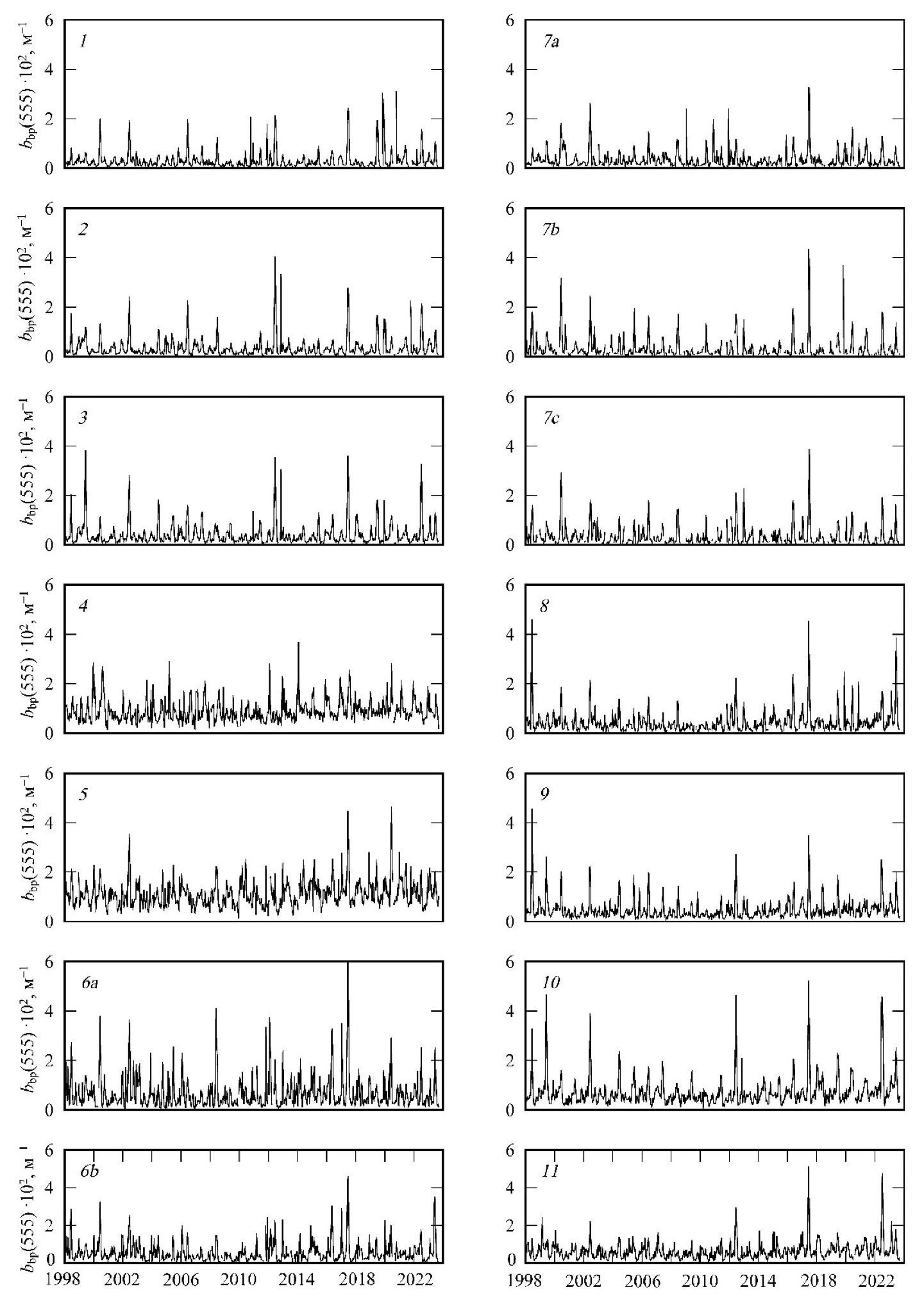 Были получены ряды данных (bbp(555), NEh, SST, Ca, aCDM(490), ZUML), рассчитанные с двухнедельным осреднением для каждого района моря (рис. 1) с 1998 по 2023 г. На рис. 2 представлена динамика bbp(555) в каждом районе моря за исследованный период. Во всех районах моря очевидна сезонная и межгодовая изменчивость этого параметра (рис. 2).