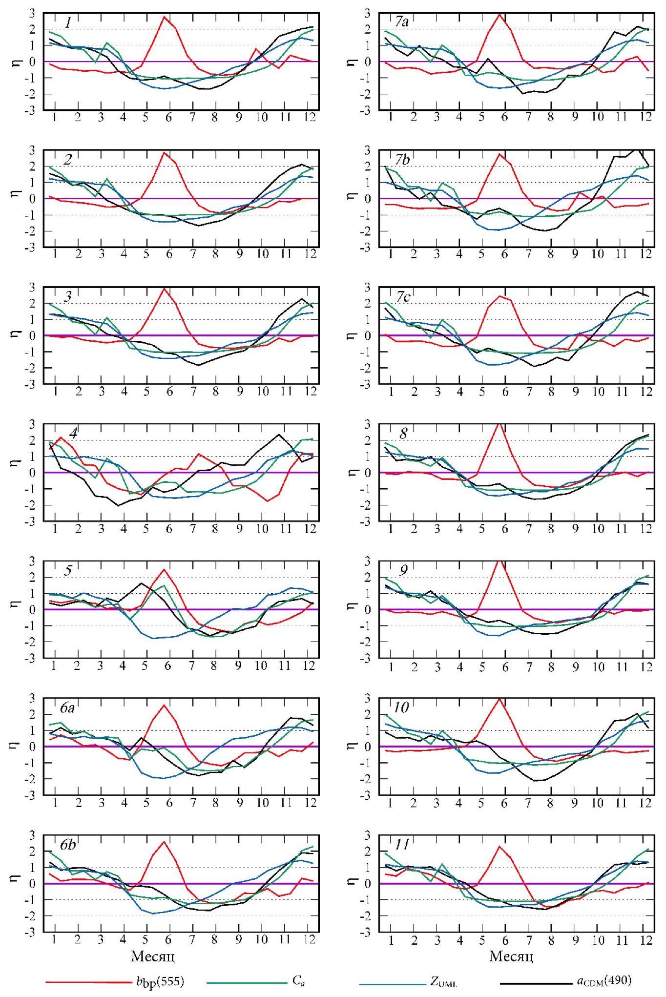 Fig. 3. Normalized anomalies η of the particulate backscattering coefficient at wavelength 555 nm (bbp(555)), concentration of chlorophyll a (Ca), thickness of the upper mixed layer (ZUML), coefficient of light absorption by colored detrital matter in total with non-algal particles at wavelength 490 nm (aCDM(490)) in particular regions of the Black Sea