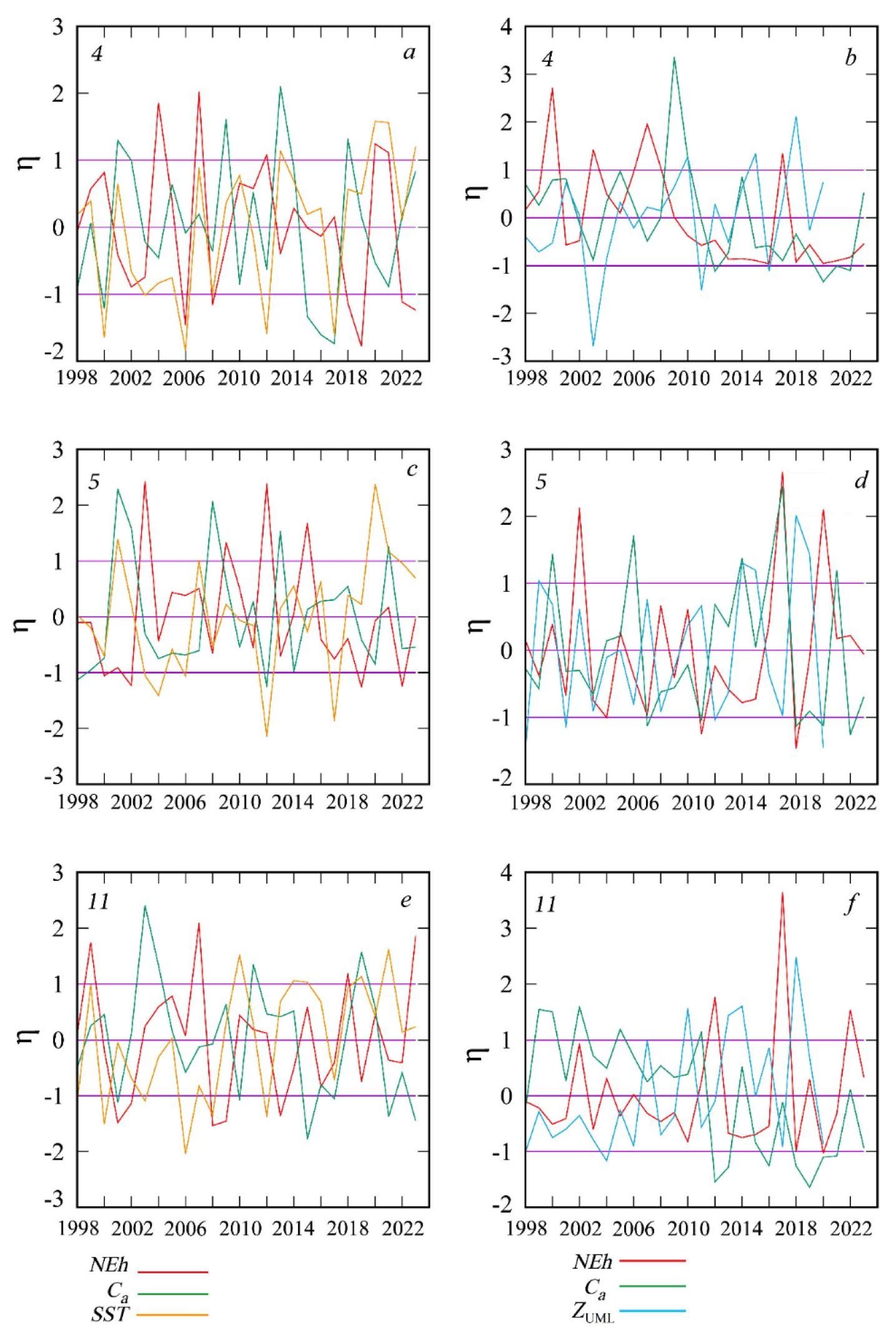 Fig. 4. Interannual variability η of normalized anomalies of G. huxleyi cell abundance (NEh), chlorophyll a concentration (Ca), sea surface temperature (SST), and thickness of the upper mixed layer (ZUML) in February (a, c, e), June (d, f) and August (b) in regions 4, 5 and 11