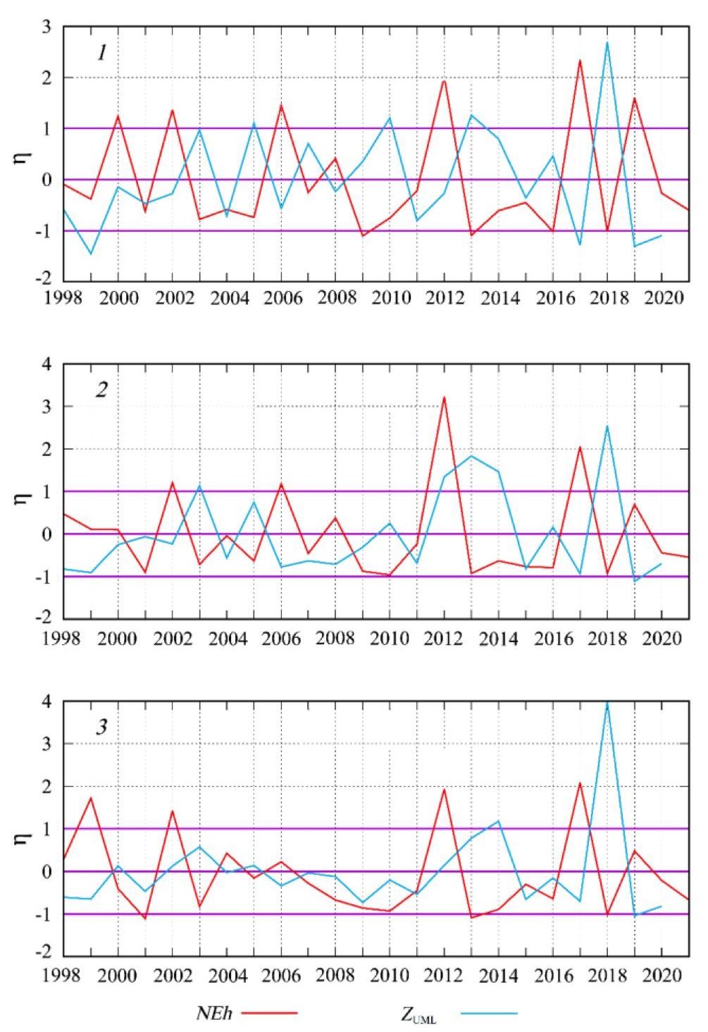 Рис. 5. Межгодовая изменчивость η нормализованных аномалий численности клеток G. huxleyi (NEh) и толщины верхнего квазиоднородного слоя (ZUML) в июне в районах 1, 2 и 3 Черного моря