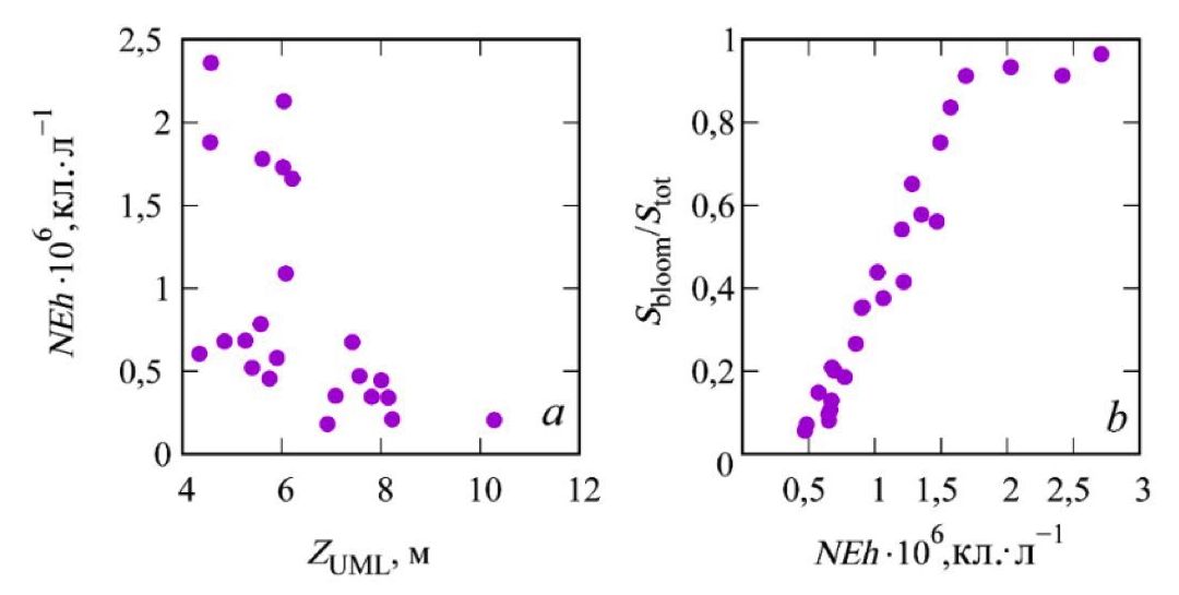Рис. 6. Зависимость между толщиной верхнего квазиоднородного слоя моря в июне (ZUML) и численностью клеток G. huxleyi (NEh) в западной глубоководной части моря (район 1) (a), между NEh в глубоководной части моря (район 1 и 2) и площадью «цветения» относительно площади моря (Sbloom/Stot) (b)