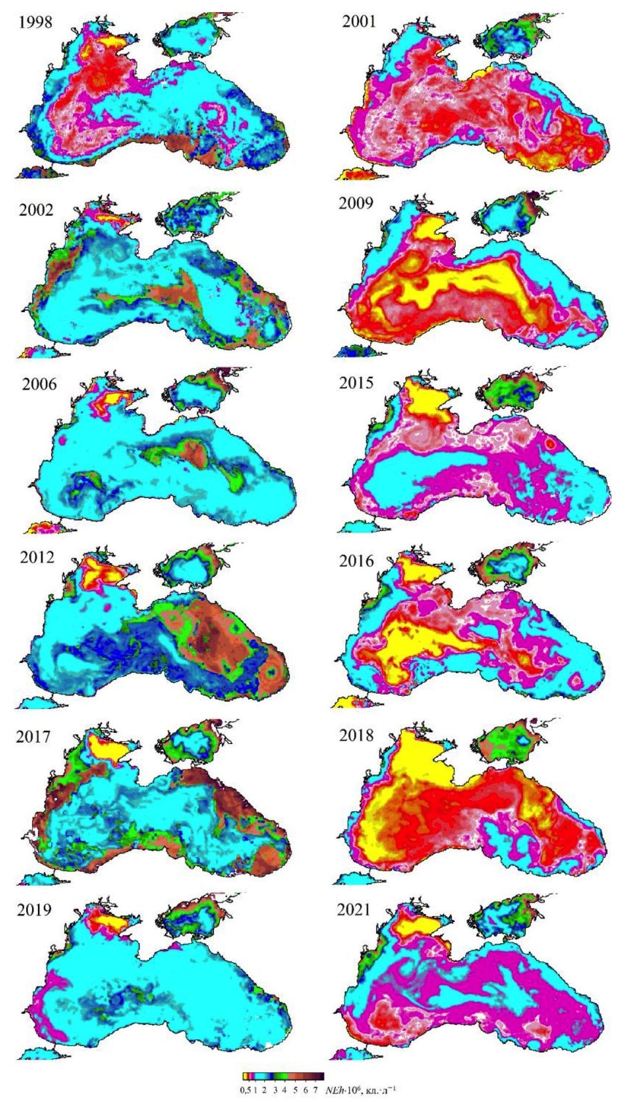Рис. 8. Карты пространственного распределения концентрации клеток G. huxleyi (NEh) в поверхностном слое Черного моря в первой половине июня в 1998, 2002, 2005, 2006, 2012 и 2017 (слева), 2001, 2009, 2011, 2015, 2016, 2018, 2021 гг. (справа)