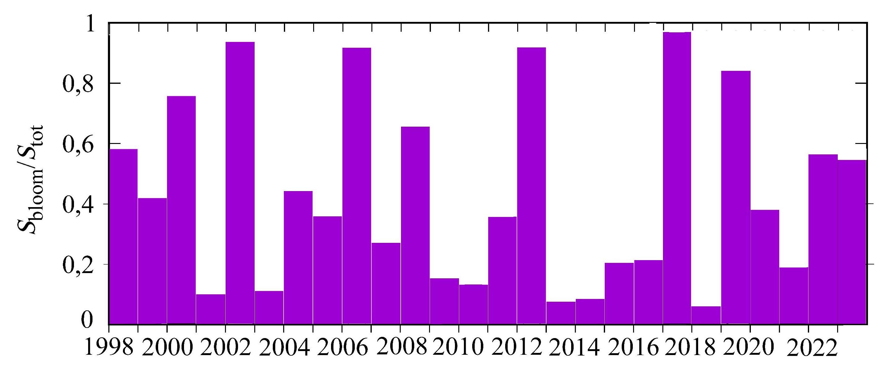 Рис. 9. Межгодовая изменчивость площади (Sbloom/Stot) «цветения» G. huxleyi в июне