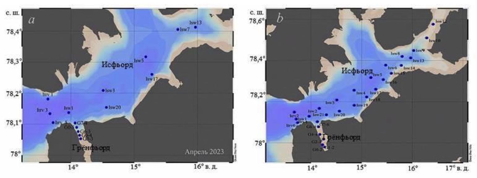 Fig. 1. Sampling stations in the fjords of Western Spitsbergen in April (а) and August (b), 2023