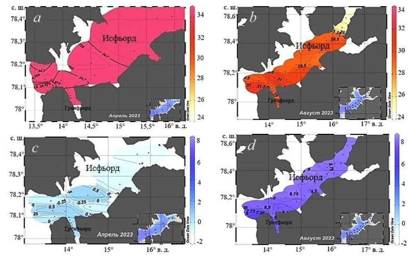 Рис. 2. Распределение гидрофизических параметров в поверхностном слое заливов Западного Шпицбергена в 2023 г.: солености в апреле (а) и в августе (b); температуры в апреле (c) и в августе (d)