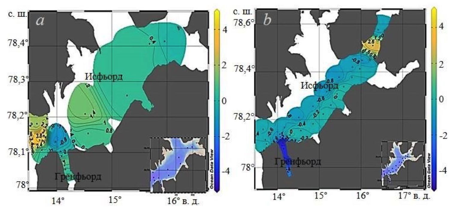 В августе значения рН на акватории Исфьорда находились в пределах 7,97–8,15. При этом значения рСО2 на большей части акватории фьорда составили ~ 350 мкатм, за исключением локальных зон с повышенными значениями 400–450 мкатм. В Грёнфьорде рСО2 изменялось в диапазоне 276–330 мкатм, рН – в диапазоне 8,14–8,20.