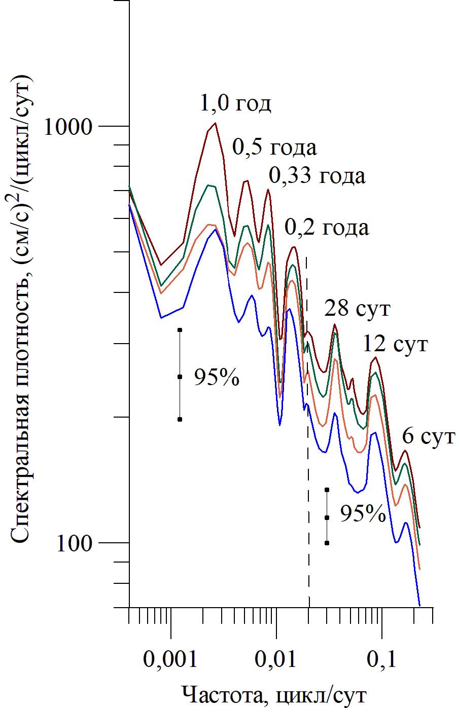 Результаты проведенной аналитической и спектральной обработки данных наря-ду с полученными ранее оценками позволили систематизировать и оценить характеристики долгопериодных колебаний прибрежного течения на масштабах внутригодовой и межгодовой изменчивости. На рис. 1 показаны статистически достоверные спектральные максимумы энергии внутригодовых колебаний течения в слое 5–20 м в диапазоне изменчивости 4 сут – 6 лет.
