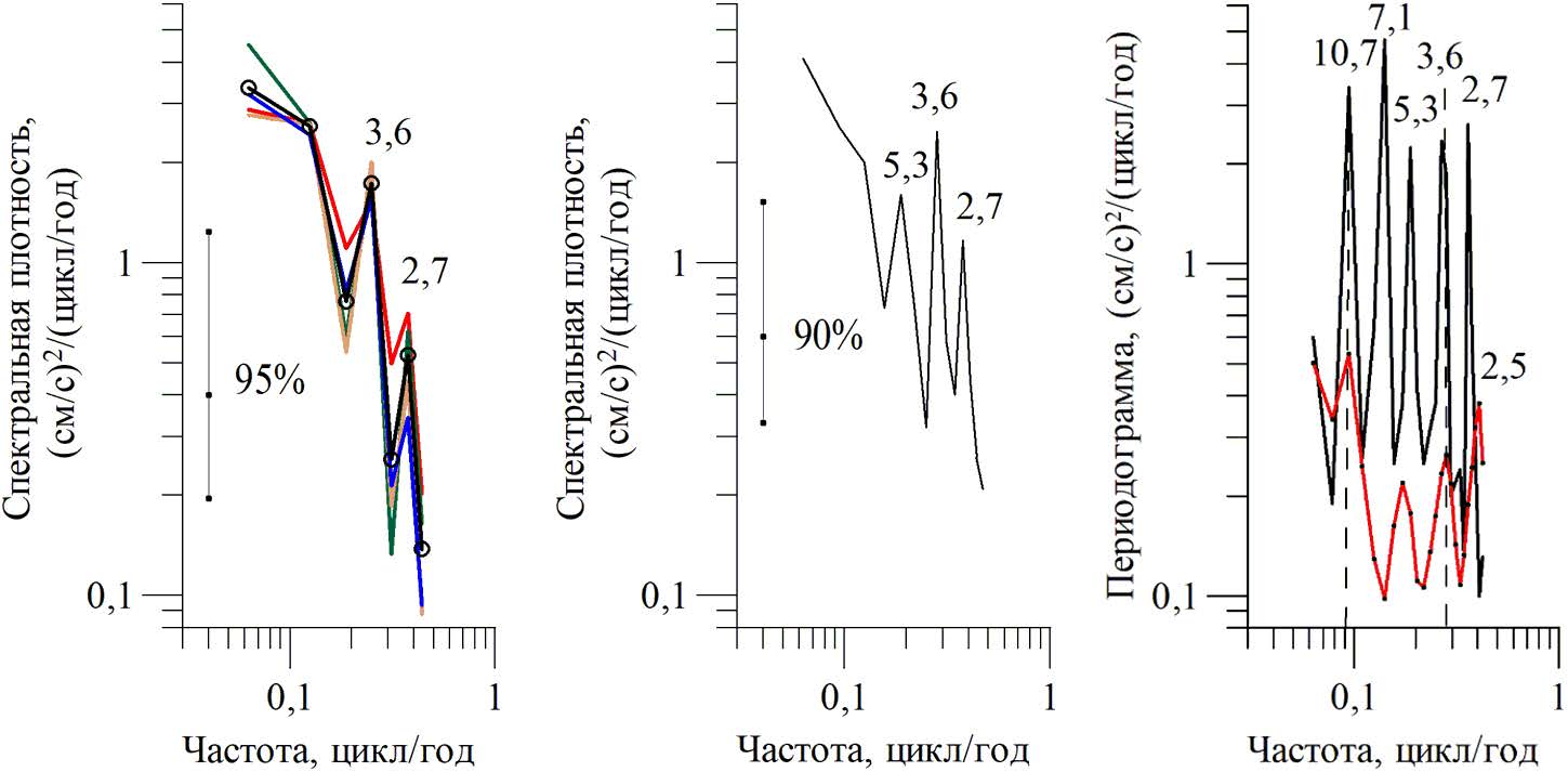 При анализе относительной изменчивости уровней спектральных плотностей (рис. 1; 2, a) следует отметить, что различия в их значениях между соседними горизонтами измерений не превышают пределы указанных 95%-ных доверительных интервалов фактически во всем диапазоне изменчивости. Таким образом, спектры, рассчитанные в 15-метровом слое прибрежных вод между горизонтами 5 и 20 м, подобны и статистически однородны, что позволяет использовать всю совокупность данных, полученных в этом слое, для интегральных оценок спектральных характеристик колебаний слоя в целом. Расчет спектра стационарного процесса (рис. 2, b) выполнен на основе сформированной совокупности центрированных векторных данных, полученных в слое. Периодограмма (рис. 2, c, черная линия) рассчитана для определения полного спектрального состава и значений периодов колебаний прибрежного течения, вносящих вклад в исследуемую реализацию. Из оценки спектра следует, что в совокупности векторно-центрированных среднегодовых вариаций, полученных за 2002–2023 гг., наряду с колебаниями прибрежного течения на периодах ~ 2,7, 3,6 и 5,3 года вклад вносят значимые колебания на периодах ~ 7,1 и 10,7 года.