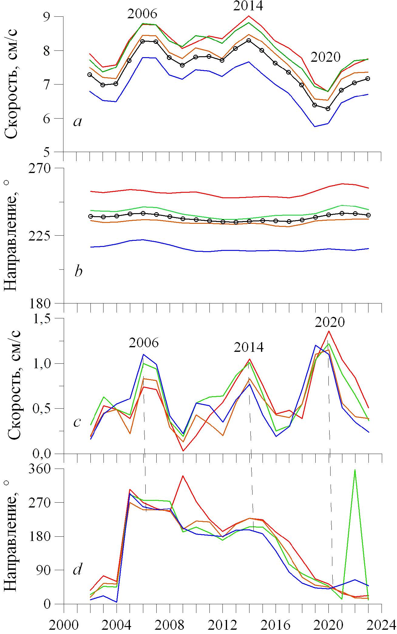 Рис. 3. Межгодовые вариации сглаженных среднегодовых значений модуля скорости (a) и направления (b) компонентов исходных векторов течения на горизонтах 5, 10, 15, 20 м (красная, зеленая, оранжевая и синяя линии соответственно) и их векторно-осредненных в слое 5–20 м значений (черные линии с кружочками), а также межгодовая изменчивость компонентов соответствующих центрированных векторов течения – модуля скорости (c) и направления (d) в слое 5–20 м
