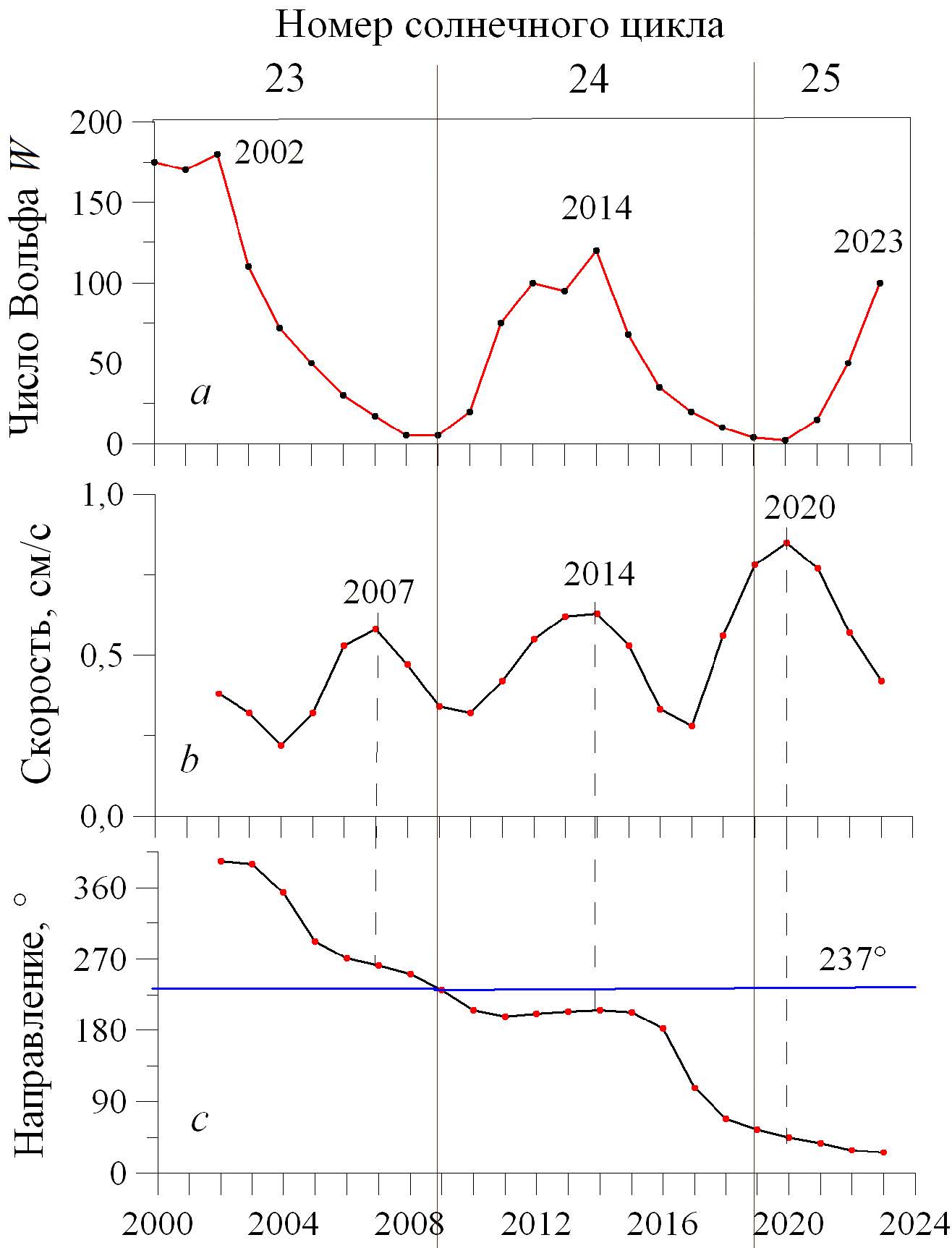 Данные о межгодовых вариациях среднегодового числа Вольфа доступны на сайте https://www.side.be/SILSO/ssngraphics. На рис. 4, b в результате сглаживания в явном виде выделены три полных периода 7-летних осцилляций центрированного вектора течения, по временным срокам соответствующих определенным фазам 23, 24, 25-го циклов солнечной активности (рис. 4, a). На рис. 4, c представлена сглаженная реализация полного циклонического разворота направления осцилляции течения за 22-летний период измерений. При этом в течение 2006–2015 гг. вдольбереговое перемещение вод при 7-летних осцилляциях прибрежного течения происходит практически в фазе, а в 2002–2003 и 2020–2023 гг. – в противофазе генеральному направлению вдольберегового течения (сплошная синяя линия 237°). Таким образом, в составе вдольберегового течения содержится изменяющийся по направлению вклад вектора 7-летних осцилляций, что приводит к периодическим изменениям модуля скорости стационарного течения. В исходных вариациях течения, приведенных на рис. 3, a, среднегодовой модуль скорости в 2014 г. достигал максимального значения 9,4 см/с, а в 2020 г. экстремально снижался до 5,8 см/с, что объясняется периодической изменчивостью вклада выявленных долгопериодных колебаний течения. Выделенные долгопериодные осцилляции прибрежных вод по своим временным масштабам соответствуют короткопериодным климатическим вариациям, активно исследуемым в атмосфере и океане в связи с их особой ролью в формировании изменений климатической системы.