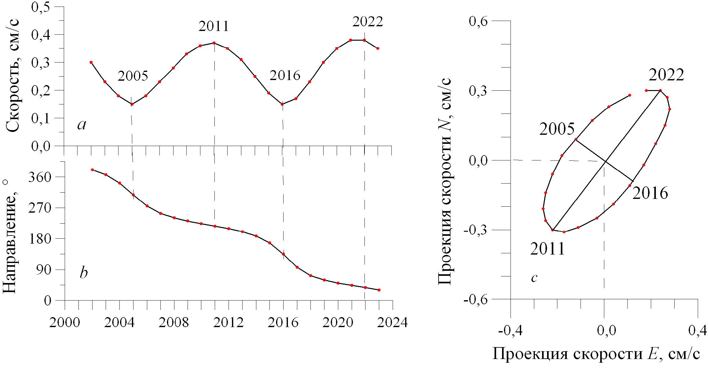 При векторной фильтрации 7-летних осцилляций течения в межгодовых вариациях сглаженных среднегодовых значений модуля скорости (рис. 5, a) выделены 11-летние колебания при полном развороте направления на 360° (рис. 5, b) центрированного вектора течения по завершении 22-летнего цикла измерений. На рис. 5, c показан соответствующий годограф, имеющий форму эллипса при циклоническом вращении среднегодовой скорости центрированного вектора течения. Годограф, построенный в правосторонней ортогональной системе координат, ориентированной на север, демонстрирует практически полный 22-летний цикл вращения вектора скорости течения за период 2002–2023 гг. Осевые линии эллипса на рис. 5, c показывают ориентацию вектора течения в 2005, 2011, 2016, 2022 гг. в соответствии с экстремальными значениями колебаний модуля скорости (рис. 5, a).